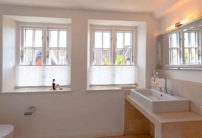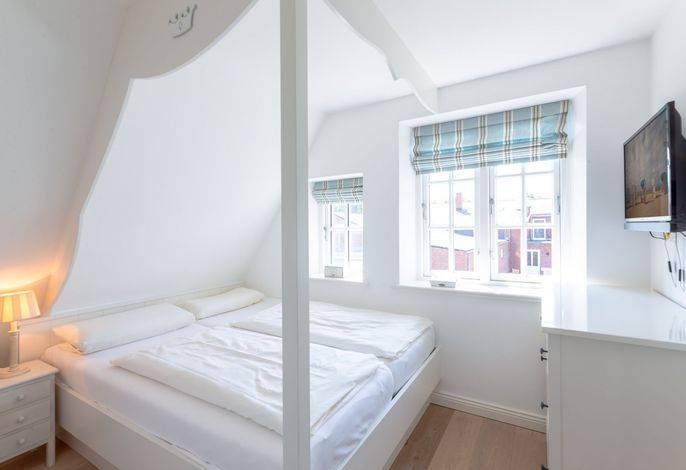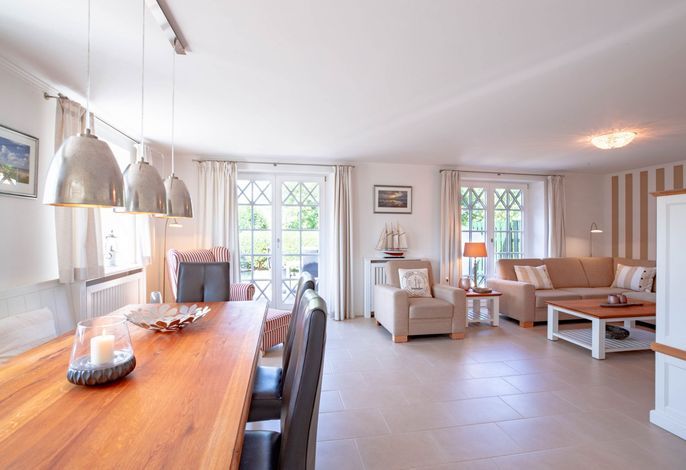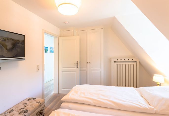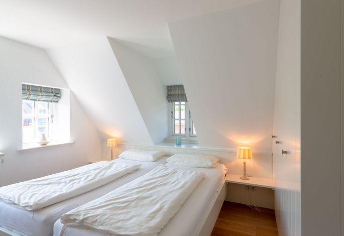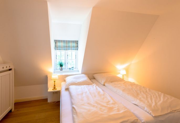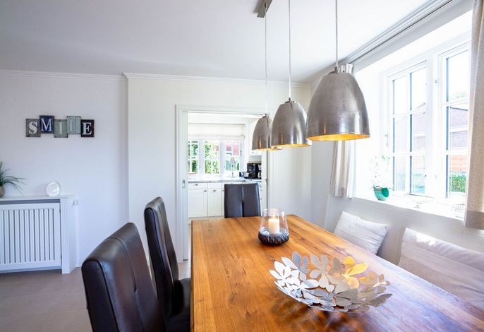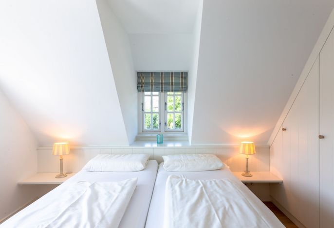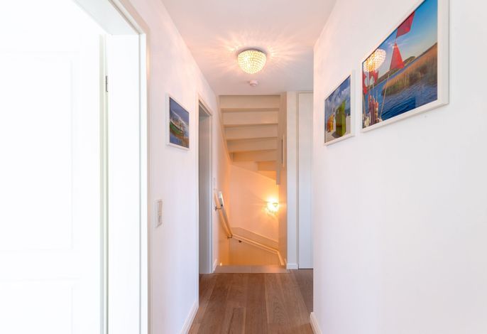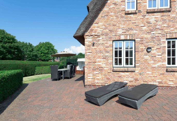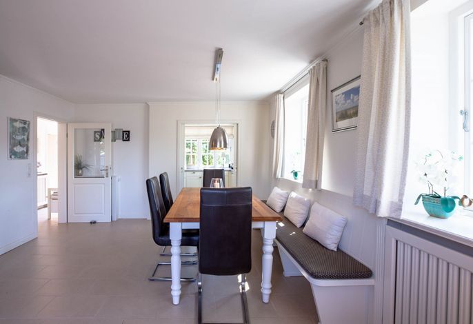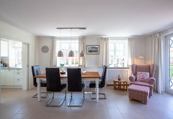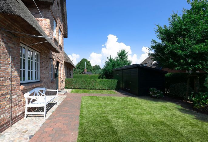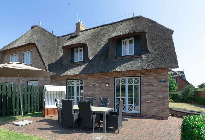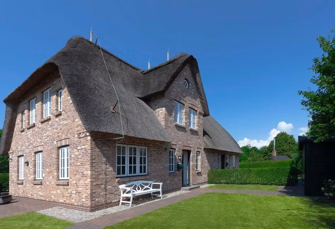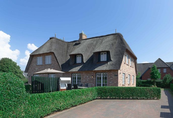 Ein typisches Friesenhaus mit sehr schöner Architektur. Die Summe schöner Details wie Holzsprossenfenster, Reetdach, Fliesen und Holzarbeiten - schafft eine wunderbare Atmosphäre. Das Doppelhaus unter Reet liegt an der Marsch, eingebettet in Wrixum - dem kleinen Nachbarort von Wyk mit dörflichem Charme. In der Nachbarschaft befindet sich ein Café mit leckerem, selbstgebackenem Kuchen, ein Fahrradverleih um die Insel per Rad zu erkunden und die Backstube des ortsansässigen Bäckers. Die Stadt Wyk mit seinen Geschäften und der Promenade sowie vom Strand nur etwa 5 - 10 Fahrradminuten entfernt.