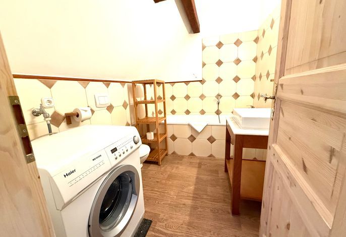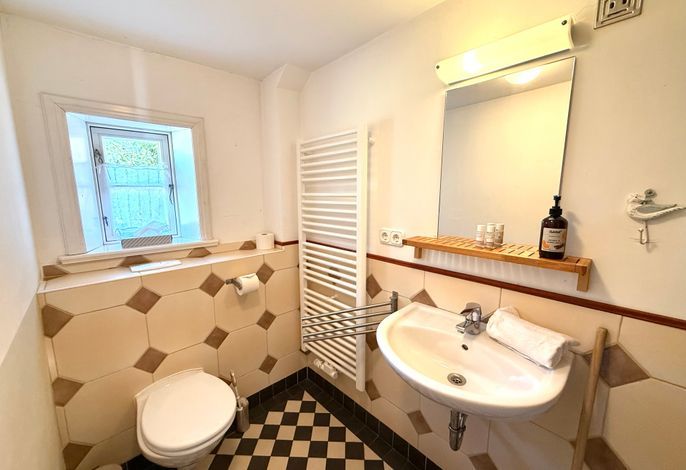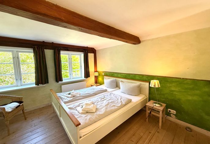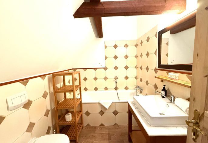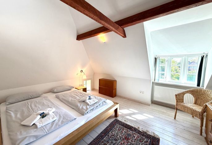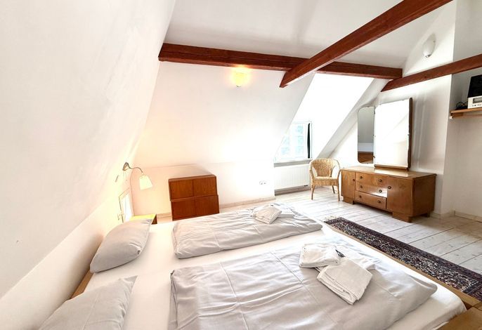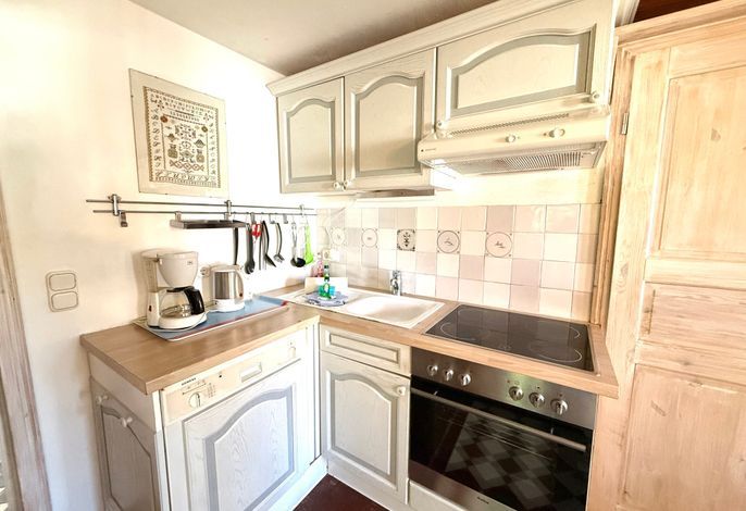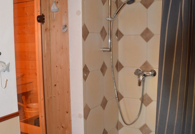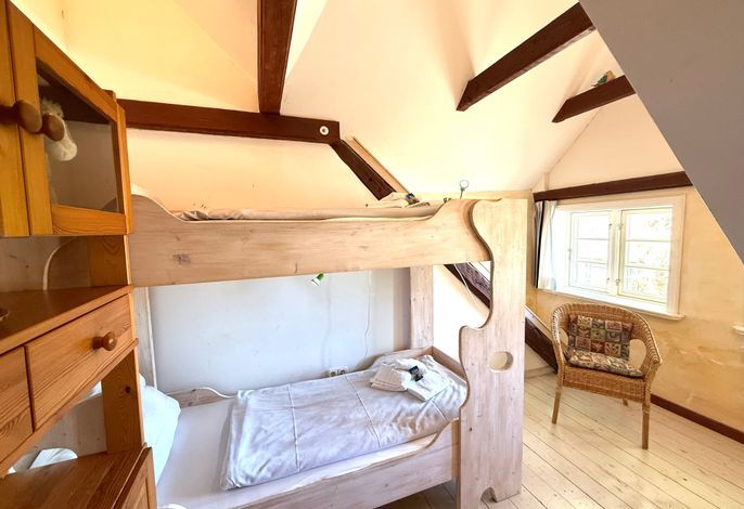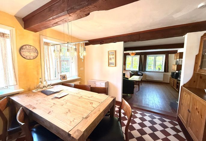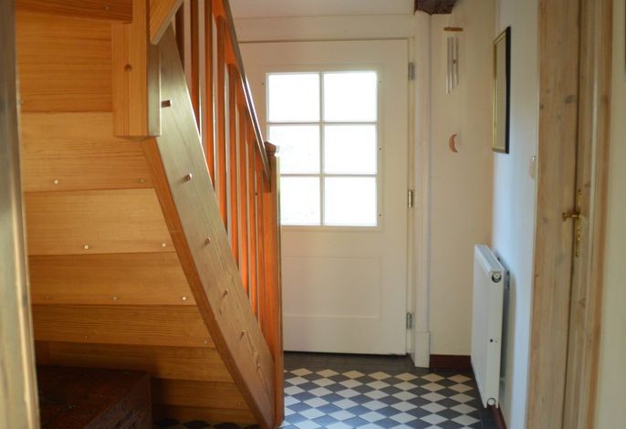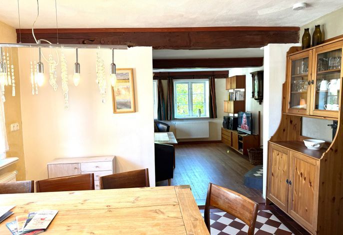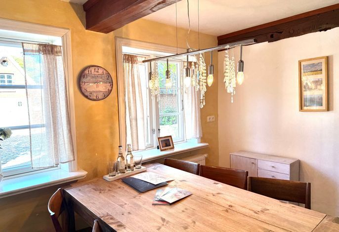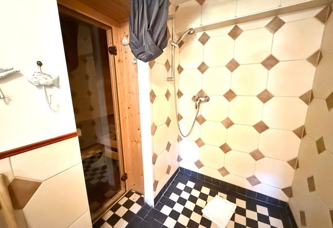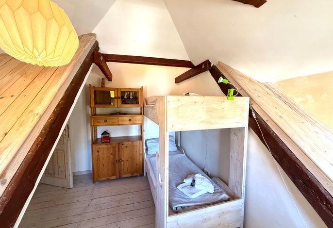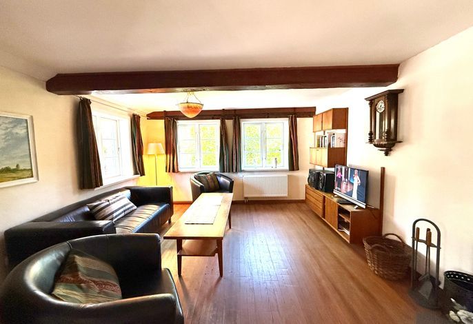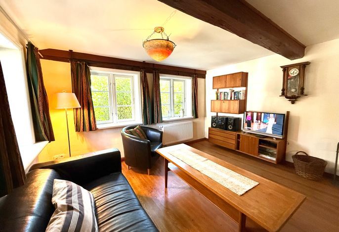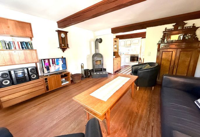 Diese Wohnung für 6 Personen und ist stilvoll und gemütlich eingerichtet. Im Wohnzimmer finden Sie einen Fernseher mit SAT-Anschluss, Musikanlage mit DVD und einen Kaminofen. Die Wohnküche hat noch den alten Fliesenboden und eine Einbauküche mit Spülmaschine. Ebenfalls im Erdgeschoss sind ein Schlafzimmer, ein Duschbad mit seniorengerechter, bodengleicher Dusche und angrenzender Sauna. Im Dachgeschoss sind das Elternschlafzimmer, ein Kinderzimmer mit Etagenbett und ein Wannenbad.