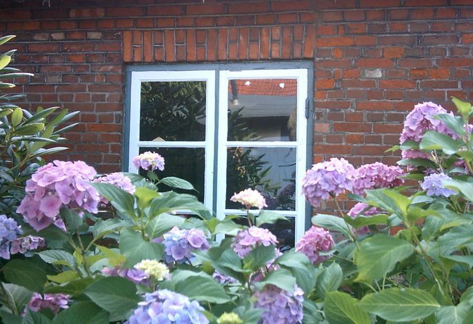 Im rückwärtigen Bereich des etwa 1000 m² großen Grundstücks, hinter dem Bauerngarten befindet sich eine große Wiese mit Sandkiste zum Spielen und Grillen. Am Gartenausgang auf der Südwestseite des Hauses finden Sie großzügige Terrassen mit Gartenmöbeln. Über die alte Hofzufahrt können Sie einen Stellplatz nutzen.