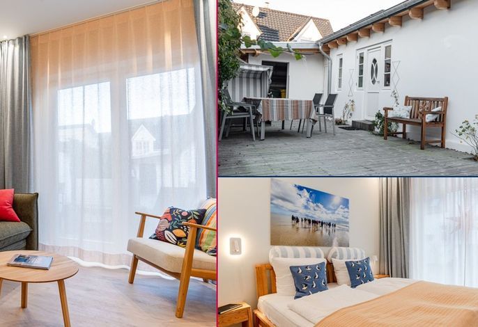 Die Ferienwohnung liegt vollständig im Erdgeschoss und verfügt über ein gemütliches Wohnzimmer, Küche, ein Schlafzimmer mit Doppelbett sowie ein Bad mit komfortabler Raindance-Dusche. Die große Couch im Wohnzimmer lässt sich zu einem weiteren Schlafplatz ausklappen, so dass bei Bedarf zwei getrennte Schlafmöglichkeiten zur Verfügung stehen. Vom Wohnzimmer gelangen Sie direkt auf Ihre private kleine Terrasse.