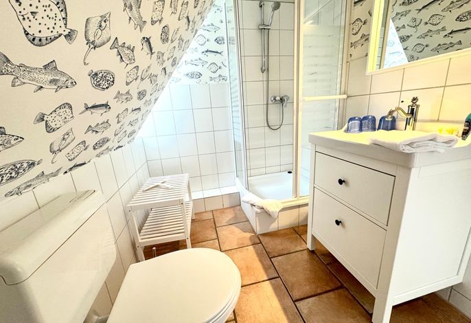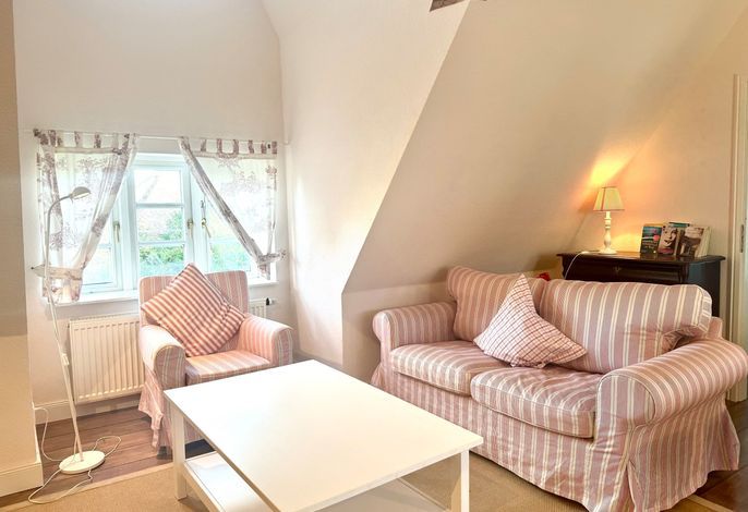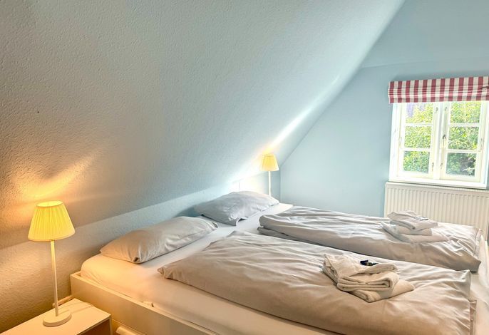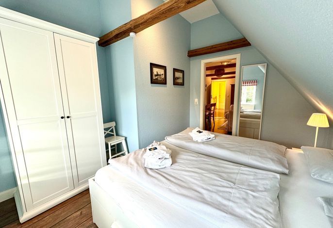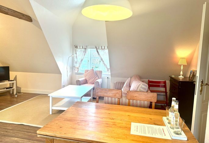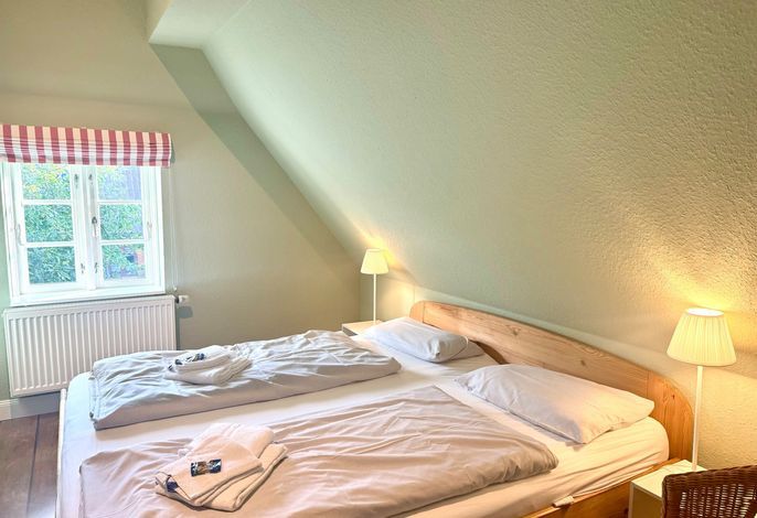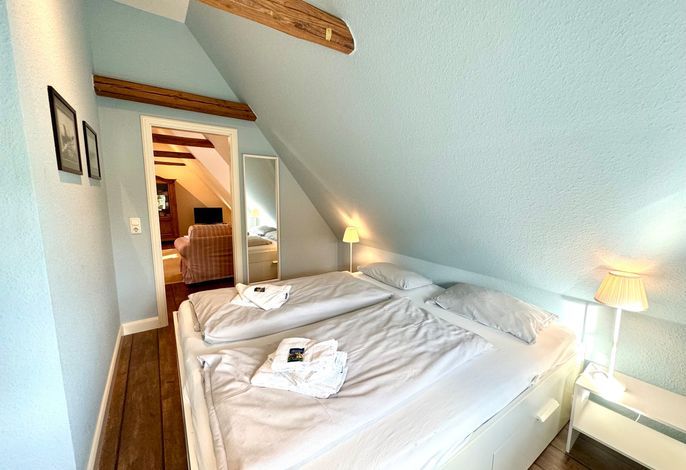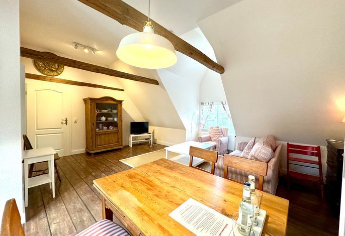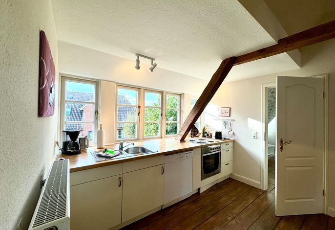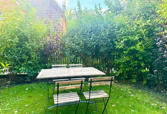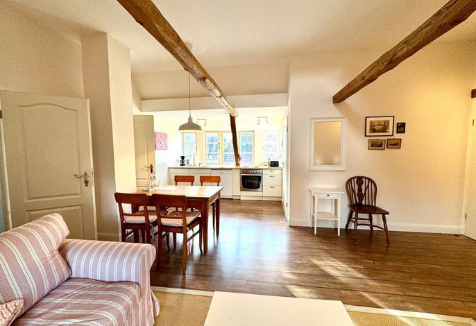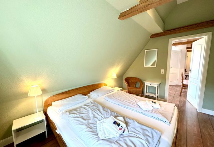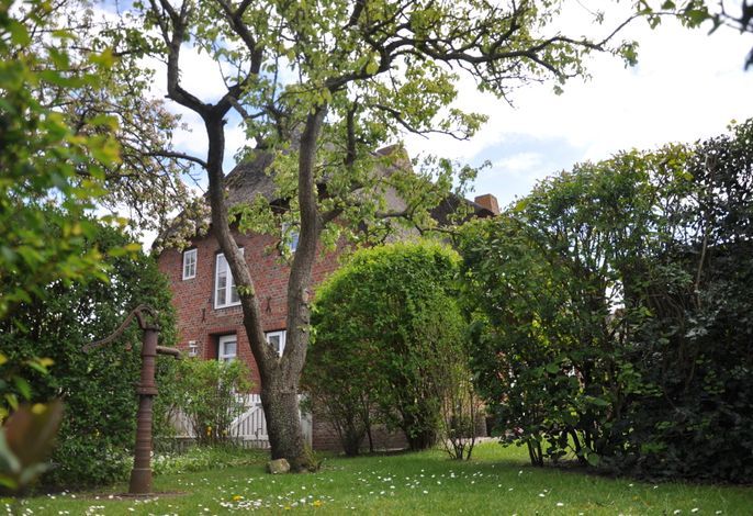 Die Große Wohnung liegt im 1. Obergeschoss. Durch den Friesengiebel ist die Wohnung groß und hell. Der Wohnraum verfügt über ein gemütliches Wohnzimmer und einem Esstisch. Aus dem Fenster schaut man in den Garten und über das ganze Dorf. Die Küche ist voll ausgestattet mit Backofen und Geschirrspüler. Auch ein alter Geschirrschrank, ein TV, eine Musikanlage und ein WLAN-Anschluss sind vorhanden. Das Badezimmer ist mit Dusche, Waschbecken und WC ausgestattet. Ein Schlafzimmer verfügt über ein Doppelbett, das andere über zwei Einzelbetten, welche jedoch auch zusammengeschoben werden können. Die Schlafzimmer sind hell und freundlich und verfügen über Kleiderschränke. Ein nettes Essen oder einen schönen Tee kann man gut im eigenen Garten genießen.