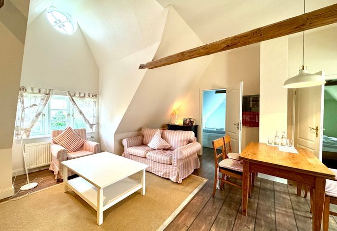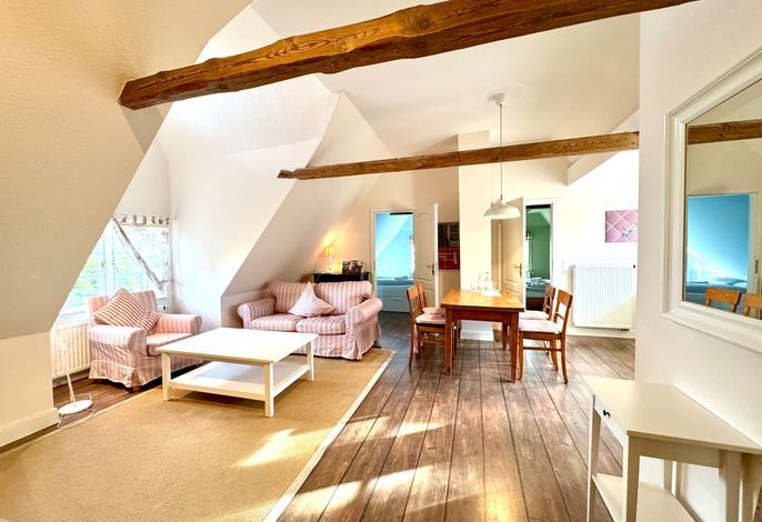 Die Große Wohnung besteht aus einem großen und schönen Wohnraum sowie zwei Schlafzimmern. Die Große Wohnung bietet Platz für bis zu 4 Personen. Ein Kinderreisebett stellen wir gern dazu. Die Große Wohnung kann ideal zusammen genutzt werden mit der Studiowohnung als gemeinsame Wohnung mit dann bis zu 6 Schlafgelegenheiten (plus Kinderreisebett).