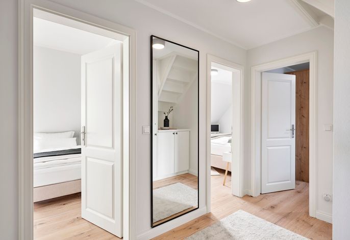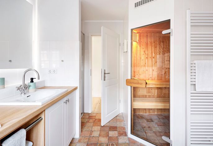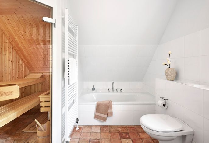Im Obergeschoss erwartet Sie eine private Wellness-Oase mit Sauna und Badewanne, eingebettet in ein stilvolles Duschbad. Zudem stehen drei behagliche Schlafzimmer zur Verfügung zwei mit Doppelbetten, eines mit zwei Einzelbetten. Zwei der Schlafzimmer bieten direkten Zugang zu einem Balkon.