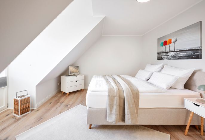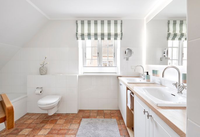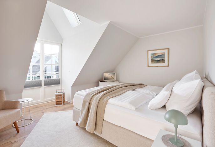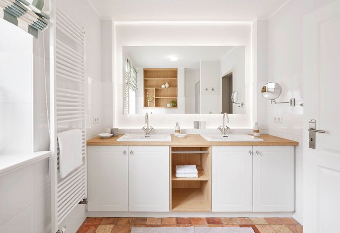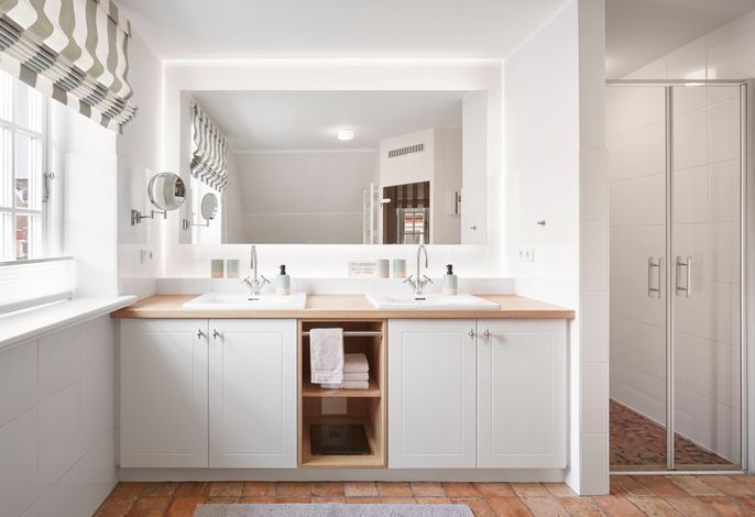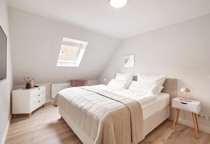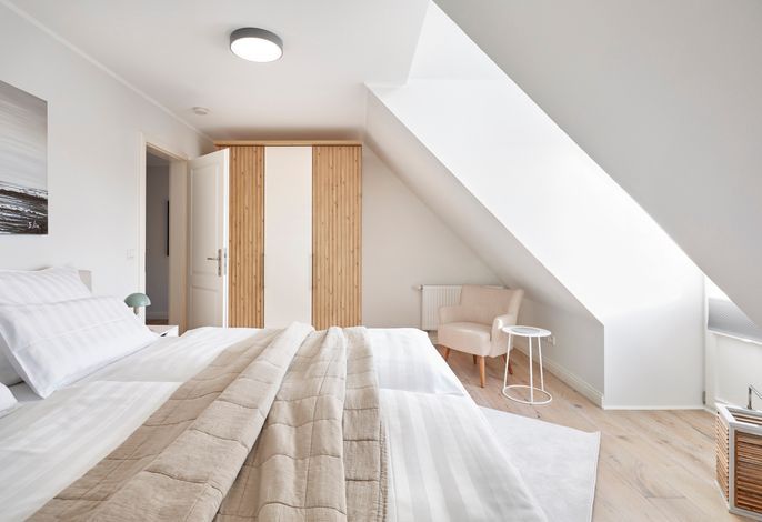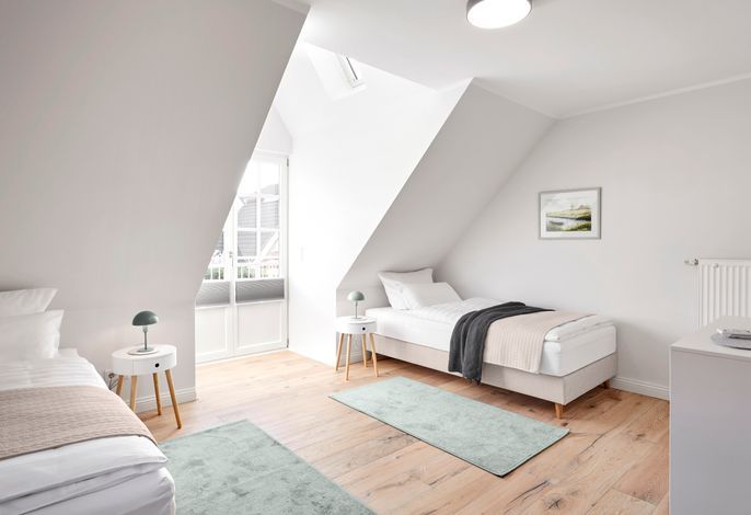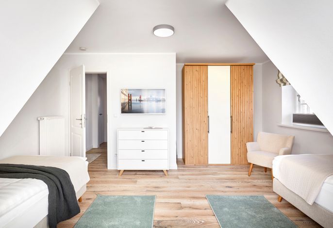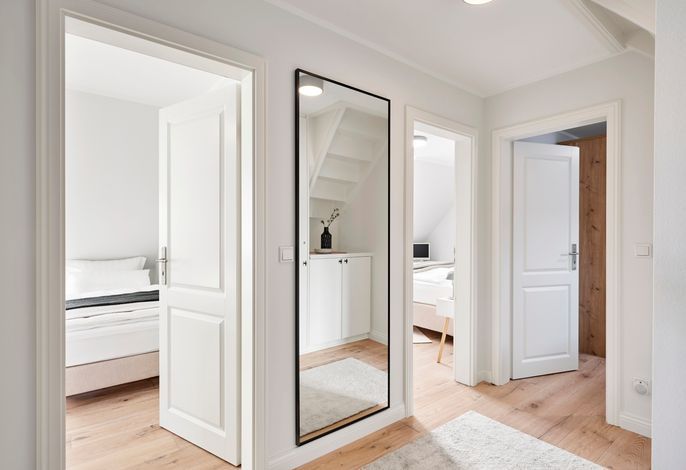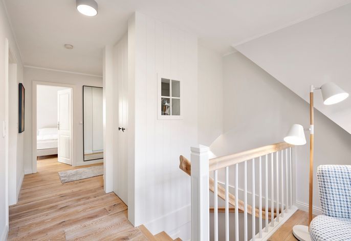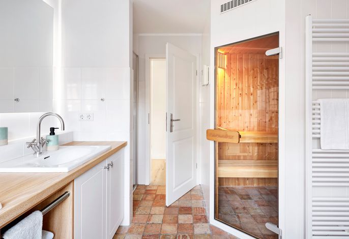 Im Obergeschoss erwartet Sie eine private Wellness-Oase mit Sauna und Badewanne, eingebettet in ein stilvolles Duschbad. Zudem stehen drei behagliche Schlafzimmer zur Verfügung – zwei mit Doppelbetten, eines mit zwei Einzelbetten. Zwei der Schlafzimmer bieten direkten Zugang zu einem Balkon.