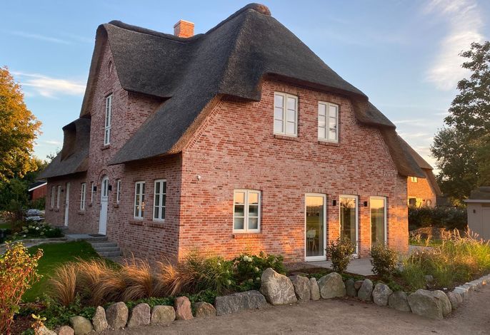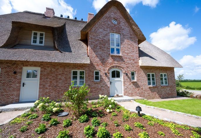 Das Haus Ferring Neest liegt am Ortsrand des Dorfes Midlum. Der Blick reicht über die Wiesenlandschaft der Föhrer Marsch bis zum Horizont. Von außen ein traditionelles Reetdachhaus, kontrastiert der Innenraum mit einem modernen...