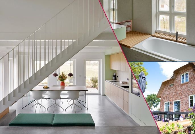 Von außen ein traditionelles Reetdachhaus, kontrastiert der Innenraum mit einem modernen Design und individuell angefertigten Einbaumöbeln.