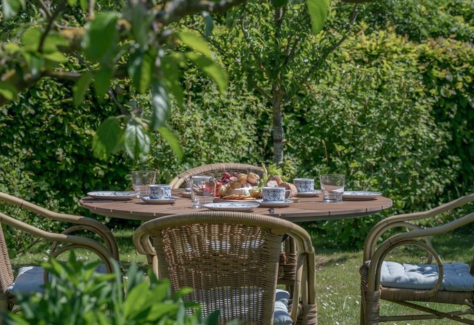 Direkt vom Wohnbereich gelangen Sie in den kleinen romantischen Garten mit Strandkorb und Gartenmöbeln   ein versteckter Lieblingsplatz für sonnige Nachmittage, stille Lesestunden oder ein Glas Wein unter dem Nachhimmel.
