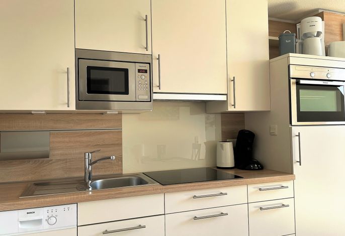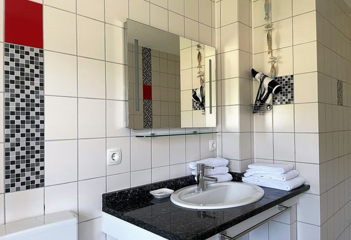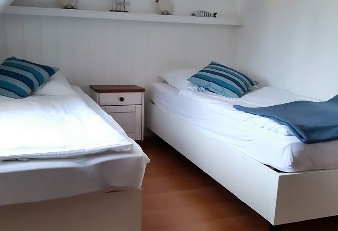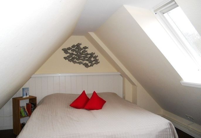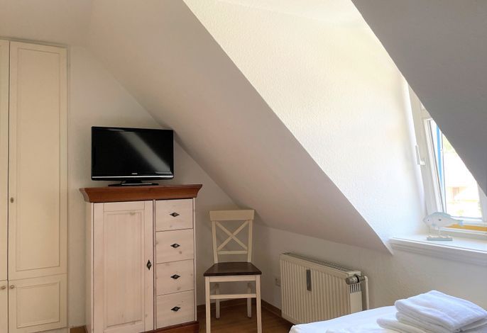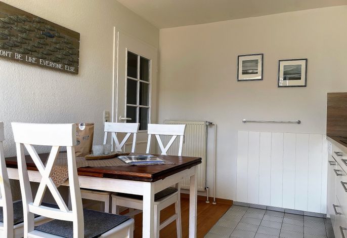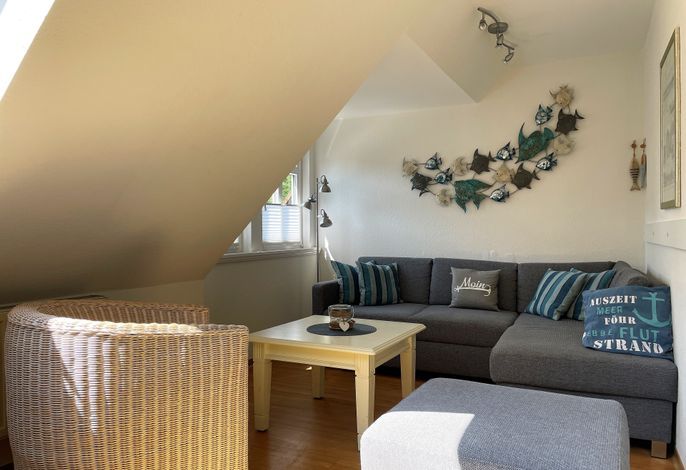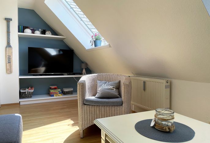 Unsere Ferienwohnung Apfelblüte (ca. 56 qm) befindet sich im ersten Obergeschoss und bietet vier Personen ein schönes Domizil für einen entspannten Föhrurlaub. Der L- förmige Wohn- Küchenbereich ist großzügig und lichtdurchflutet. Die offene, vollausgestattete Küchenzeile mit Ceranfeldherd, Backofen, Geschirrspüler, Mikrowelle und Essplatz ist modern und ansprechend. Der Wohnbereich mit hochwertiger Couchgarnitur, großem Flachbild-TV, DVD-Player, Musikanlage, WLAN und einer kleinen, aber feinen Auswahl an Lesestoff und Gesellschaftsspielen lädt zum Verweilen ein. Vom Flur aus gelangen Sie in die übrigen Räume. Ein Schlafzimmer mit zwei Einzelbetten ( eines davon steht unter direkter Dachschräge)mit Kleiderschrank verfügt über einen zweiten Flachbild-TV. Ein Doppelbett befindet sich im gemütlichen Dachgeschoss. Das Badezimmer mit Dusche und Fenster ist hell gefliest und modern. Die Wohnung Apfelblüte wurde von den Eigentümern liebevoll eingerichtet und dekoriert. Die Wohnung Apfelblüte verfügt über einen Terrassensitzplatz. Alle Einkaufsmöglichkeiten sowie die Promenade und der Strand sind in wenigen Gehminuten erreichbar. Unsere Ferienwohnung Apfelblüte ist ein ideales Domizil für Familien!