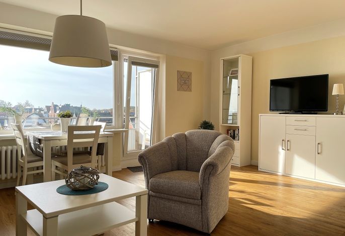 Die helle ca. 48 qm große Wohnung Atlantischer Hof 26 befindet sich im vierten Stock und es erwartet Sie vom Balkon aus ein traumhafter Blick auf die Nordsee. Die stilvoll eingerichtete Ferienwohnung eignet sich für 1 bis 2 Personen ideal, die gerne zentral in der Wyker Innenstadt Ihren Urlaub erleben möchten. Das geräumige Wohnzimmer mit integrierter Essecke und einem hochwertigen Schrankbett (160 x 195 cm) ist durch die große Fensterfront lichtdurchflutet und lädt zum Verweilen ein. Das kleine, aber feine Bad ist funktional und verfügt über eine Dusche. In der separaten Küche können Sie friesische Köstlichkeiten zaubern, wenn Sie nicht in einem der zahlreichen Restaurants essen gehen möchten. Sobald Sie das Haus per Treppe oder per Aufzug verlassen, sind Sie bereits in der Wyker Innenstadt mit einladenden Cafés, kleinen Geschäften, einem Bäcker, Schlachter und natürlich dem Strand. Genießen Sie Ihren Urlaub in einer ansprechenden Wohnung und einer traumhaften Lage!