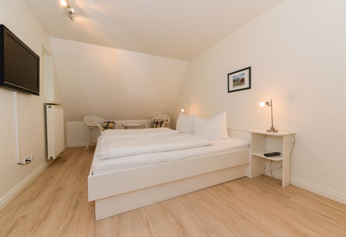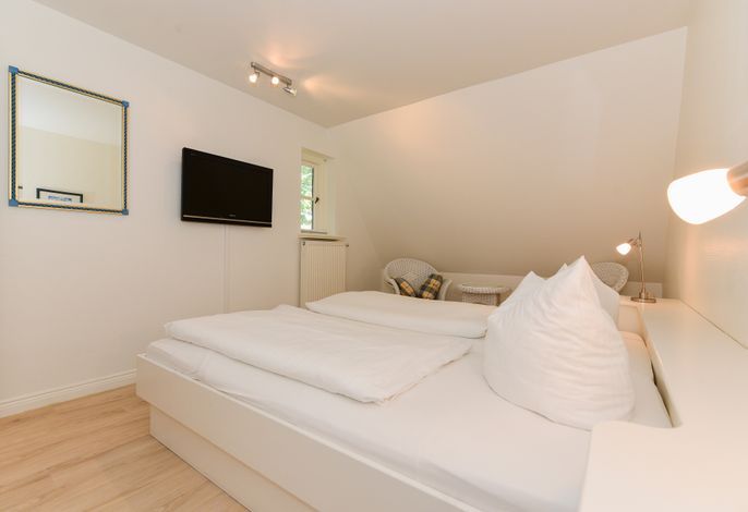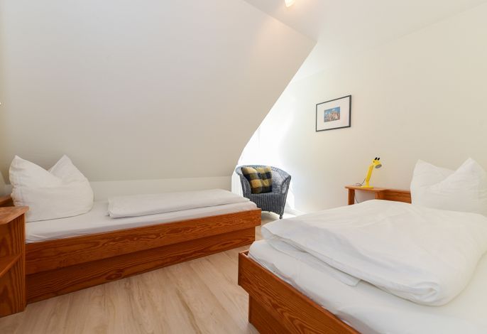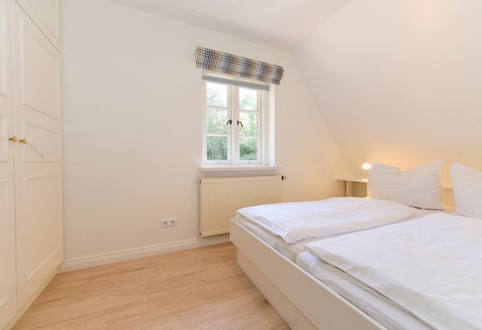 Im Obergeschoss befinden sich zwei geräumige Schafzimmer mit komfortablen Doppelbetten und viel Stauraum sowie ein weiteres Schlafzimmer mit zwei Einzelbetten - perfekt für Kinder.