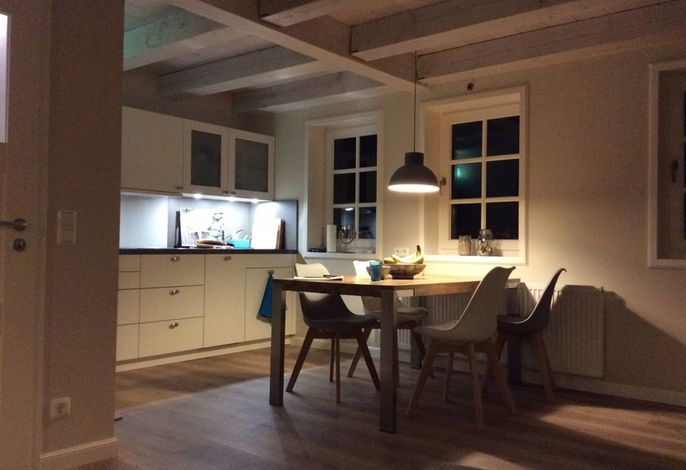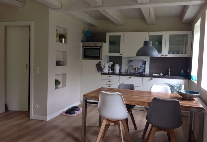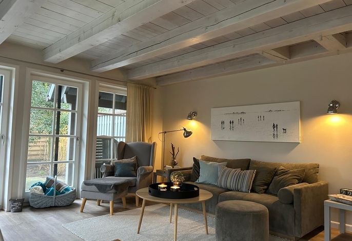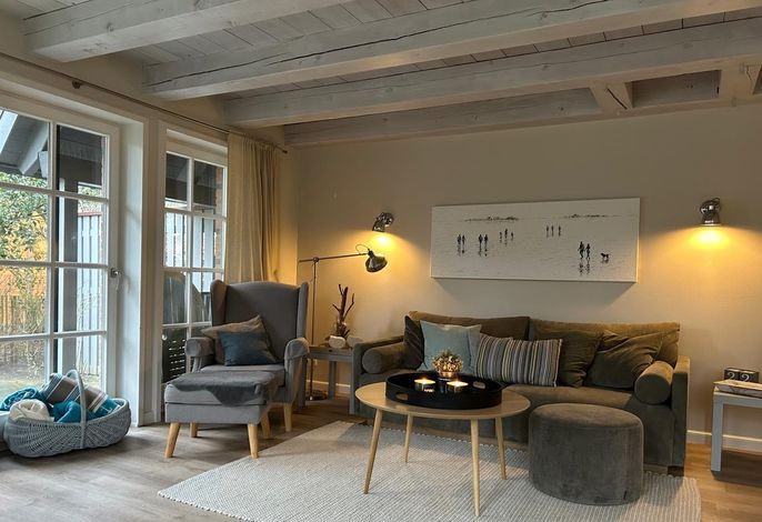 Das Ferienhaus Auszeit liegt im idyllischen Oldsum, in einer ruhigen kleinen Seitenstraße, am Rande der Marsch. Das ca. 100 qm große Haus ist gerade sehr aufwendig saniert und modernisiert worden. Es besticht durch seine hochwertige, komfortable Ausstattung sowie die helle und freundliche Farbgebung, die sich in allen Räumen wiederfindet. Im Wohnbereich befindet sich eine moderne Einbauküche, die mit Markengeräten ausgestattet ist. Sie beinhaltet, Geschirrspüler, Cerankochfeld, Umluftbackofen, Kühlschrank mit Gefrierfach. Die Grundausstattung wie Toaster, Kaffeemaschine, Wasserkocher, Geschirr, Besteck und alles, was man zum Kochen und Backen braucht, ist ebenfalls neu und in ausreichender Menge vorhanden. Der großzügige Essplatz eignet sich für gesellige Mahlzeiten, aber auch für lange Spieleabende. Eine Auswahl an Gesellschaftsspielen ist vorhanden. Die gemütliche Sitzecke lädt ein, die Abende auch bei schlechterem Wetter entspannt zu genießen. WLAN, Sat-TV mit Blue Ray Player und einer Musikanlage inklusive Bluetooth, an der alle herkömmlichen Smartphones angeschlossen werden können, tragen zur Unterhaltung bei.