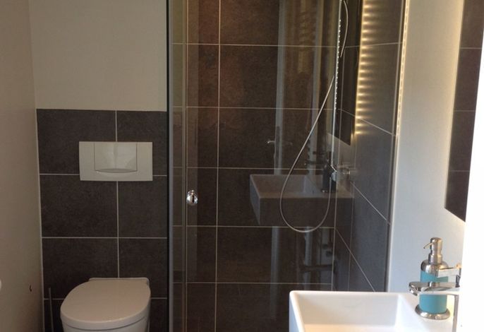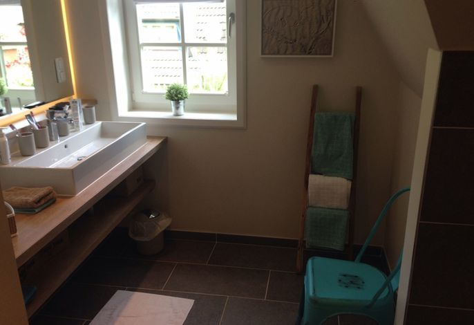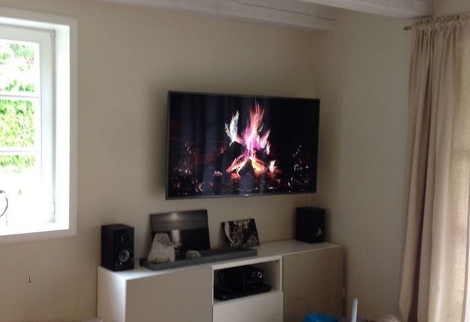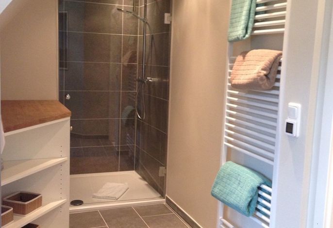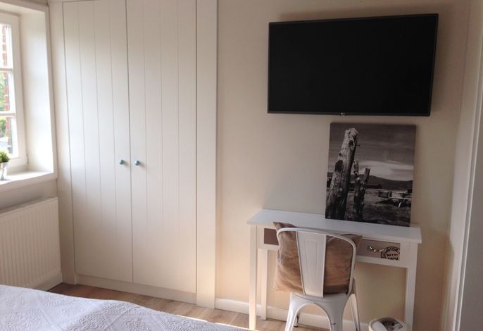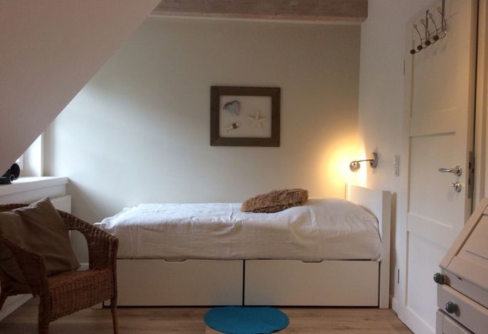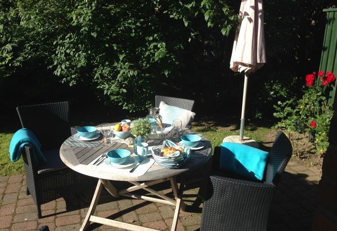 Die windgeschützte Südterrasse ist mit schönen Gartenmöbeln ausgestattet, außerdem stehen den Gästen zwei bequeme Gartenliegen zur Verfügung. Es gibt zwei moderne Duschbäder mit WC, im oberen Bad befindet sich eine Waschmaschine. Die beiden Schlafzimmer sind mit viel Liebe zum Detail eingerichtet, ein Zimmer mit Doppelbett und TV-Gerät, das andere hat zwei gemütliche Einzelbetten , eins davon mit einem zusätzlichen Ausziehbett. Somit ergeben sich 5 reelle Schlafplätze. Zur weiteren Ausstattung gehören Fön, Bügeleisen/Brett Wäscheständer, Hundenäpfe, Reinigungsgeräte inklusive eine Auswahl an Grundreinigungsmitteln, sowie Hochstuhl und Kinderbett bei Bedarf. Parkplätze befinden sich vor dem Haus.
