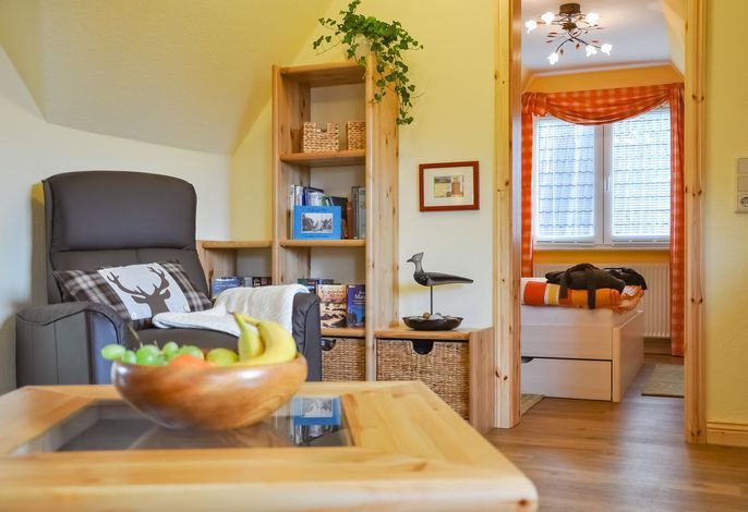 Der Dörpwundt liegt ganz ruhig und versteckt im schönen Friesendorf Wrixum. Die liebevoll und individuell eingerichtete Ferienwohnung ist ca. 60 m² groß und wurde im Juli 2013 komplett saniert und neu möbliert. Es erwartet Sie eine, zum Wohlfühlen helle und freundliche Wohnung für bis zu 3 Personen. Die Obergeschosswohnung besteht aus einer modernen, komplett ausgestatteten Küche mit Esstisch und Stühlen, einem Badezimmer mit Wanne und Dusche, einem Doppelbettschlafzimmer, sowie einem Einzelbettschlafzimmer. Das gemütliche Wohnzimmer mit SAT-TV, Radio und kostenfreiem W-LAN Anschluss runden einen angenehmen Urlaub ab. Der gemeinschaftliche Garten mit Gartenmöbeln stehen für Sie bereit. Das Haus liegt zentral zwischen zwei großen Fahrradwegen. Hier erleben Sie Entspannung pur über alle vier Jahreszeiten. Die Stadt Wyk, mit allen Sehenswürdigkeiten wie der Hafen, die Strandpromenade Sandwall mit ihren vielen kleinen Geschäften und der Sandstrand ist mit dem Rad in nur 5 bis 10 Minuten erreicht. In Wrixum selbst befindet sich eine Bäckerei, verschiedene Restaurants sowie zwei Fahrradverleihe.