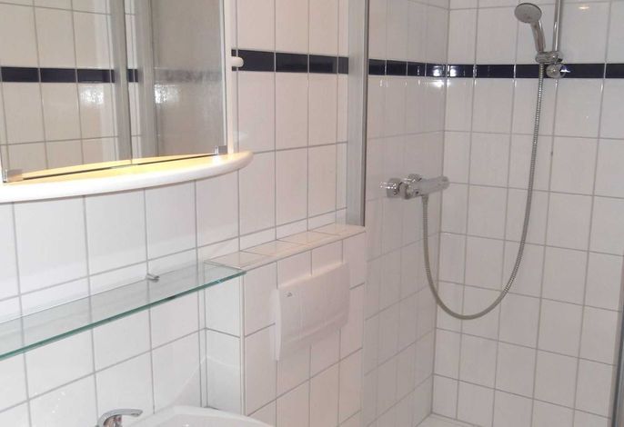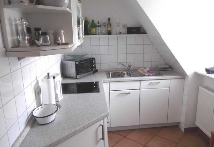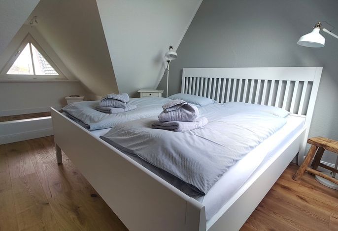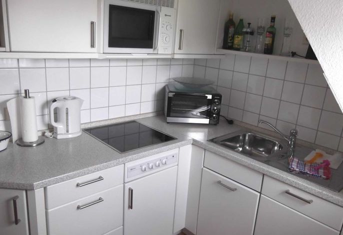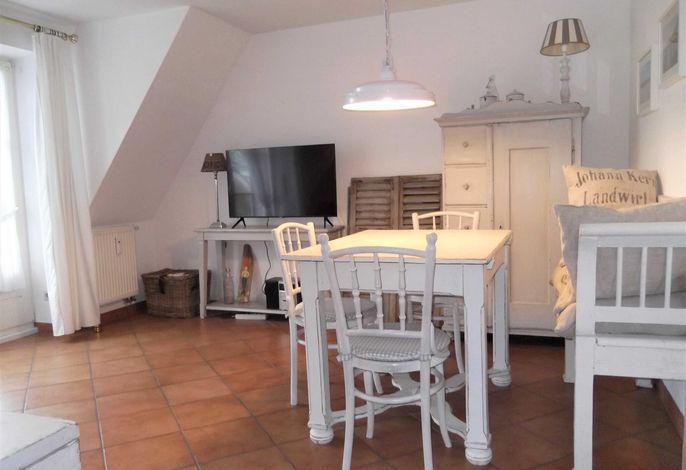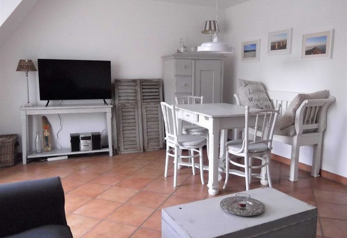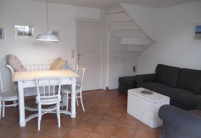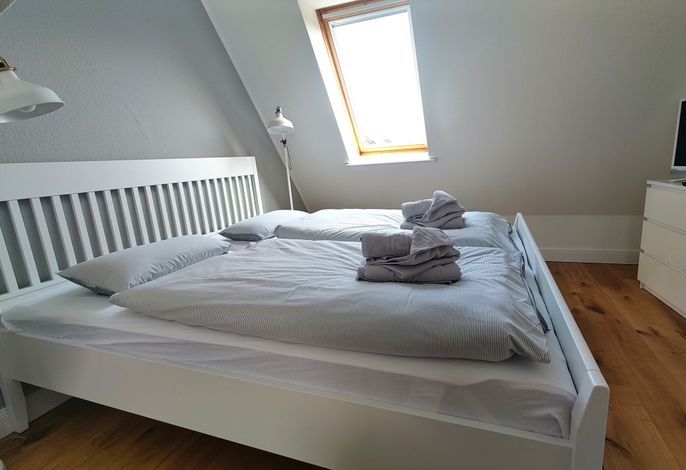 Auf der ersten Etage befinden sich das Wohnzimmer mit Essplatz, die separate Küche und das Duschbad. Vom Wohnzimmer gelangt man direkt zum südwestlich gelegenen Balkon. Vom Flur aus erreichen Sie über die Treppe das Schlafzimmer mit Doppelbett und einem zweiten Fernseher.