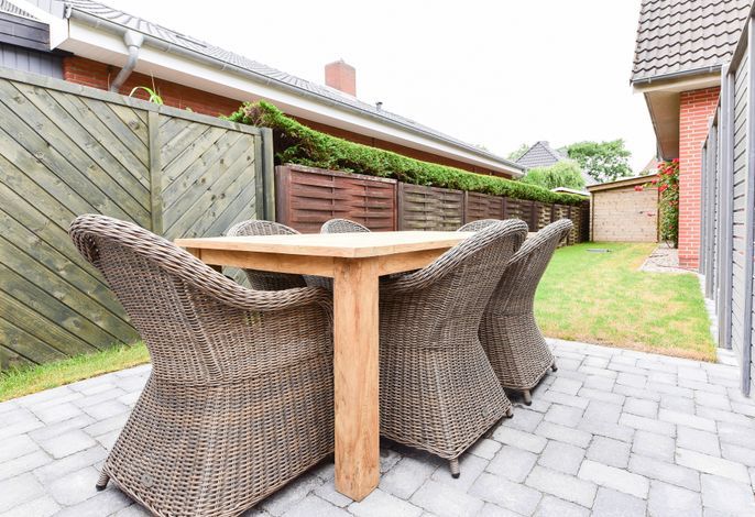Genießen Sie sonnige Stunden auf der eigenen Terrasse, welche mit hochwertigen Gartenmöbeln und einem Strandkorb ausgestattet ist.