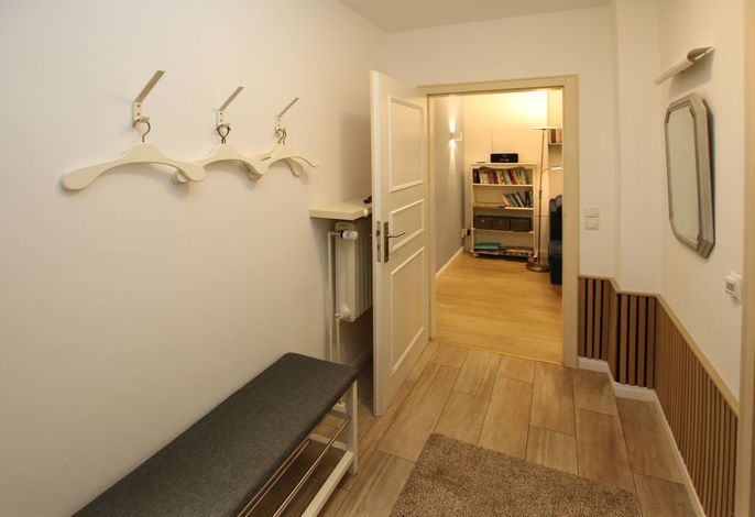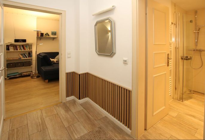 3-Zimmer-Nichtraucherwohnung im Erdgeschoß mit Süd/West Terrasse. WOHNZIMMER mit Couch, 1 Sessel, Couchtisch, Esstisch mit 4 Stühlen und moderne KÜCHENZEILE. SCHLAFZIMMER 1: Doppelbett (1,80 x 2 m) und eingebauter Kleiderschrank. Schlafzimmer 2: Etagenbett, Kleiderschrank, Korbsessel. BAD mit Dusche und WC . KELLER: gemeinschaftliche Münzwaschmaschine und -trockner. Der Garten hinter dem Haus kann mitgenutzt werden. Schöne große Terrasse mit Strandkorb und Gartenmöbeln. Parkplatz am Haus.