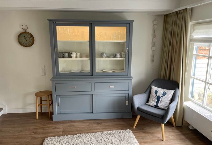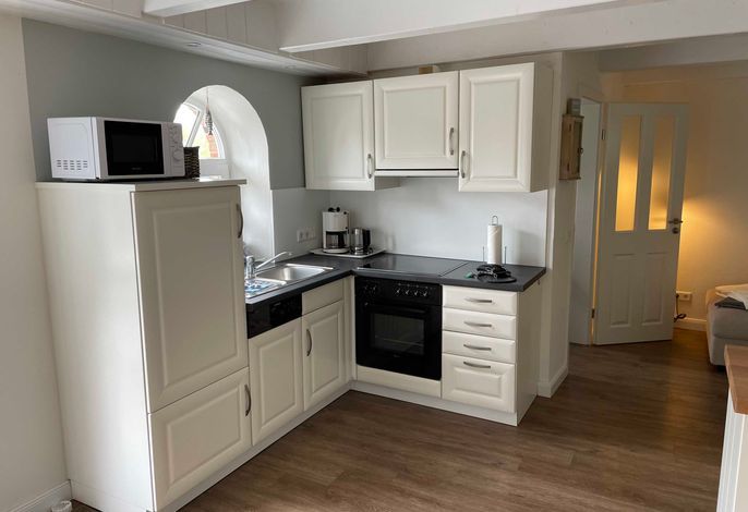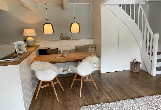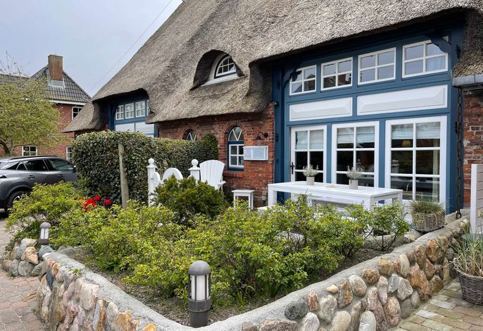 Die Ferienwohnung Bi de Mühle befindet sich im Friesenhof Oluf, einem Reedgedeckten ehemaligen Bauernhaus . Sie bietet auf ca. 80qm Platz für 5 Personen und verfügt im Erdgeschoss über einen großen Wohn/ Essraum mit offener Küche .