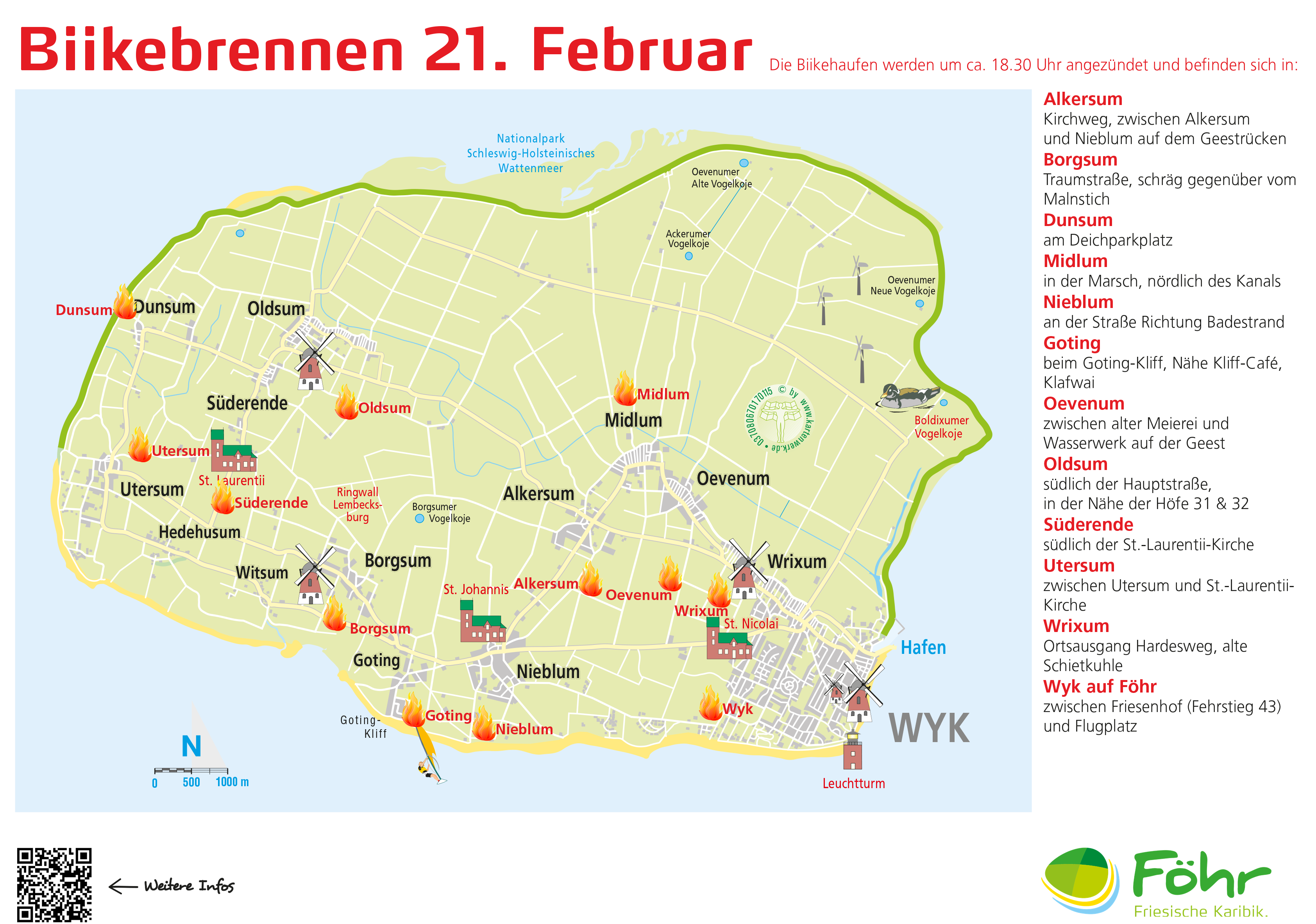 Die Biikehaufen werden um ca. 18:30 Uhr angezündet und befinden sich in: