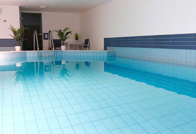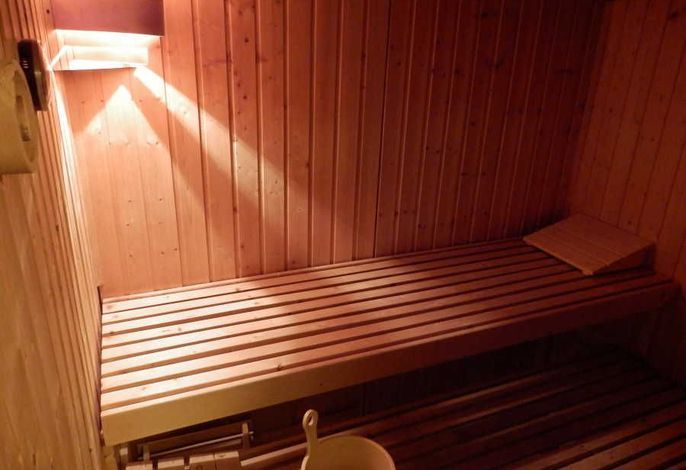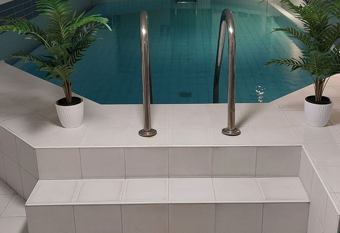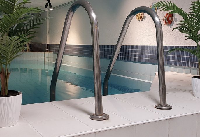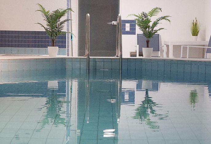 Als besondere Attraktion bietet Ihnen unsere Anlage einen unter der großen Rasenfläche gelegenen Pool-Bereich mit einem 8 x 4 m großen Schwimmbad. Zum Pool-Bereich gehört auch eine finnische Sauna. Bitte beachten: Es handelt sich hierbei um eine kostenlose,