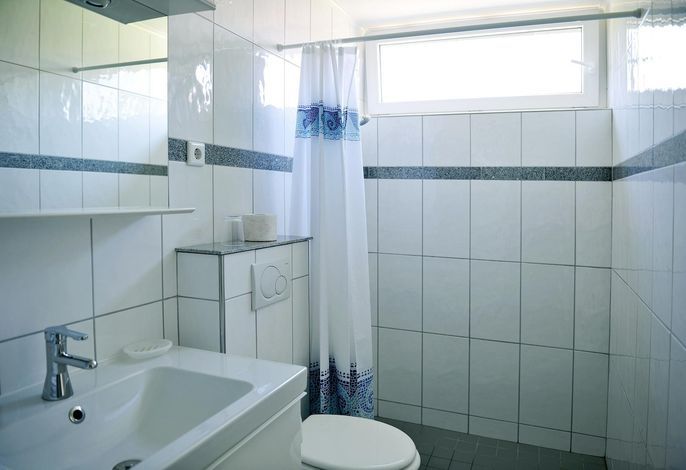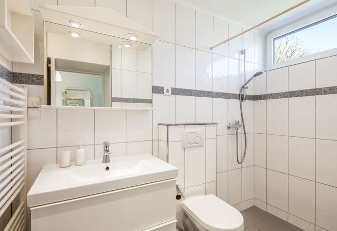 Die Dusche ist komplett ebenerdig und macht einen hellen und freundlichen Eindruck.