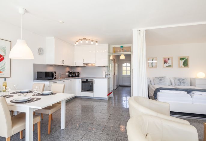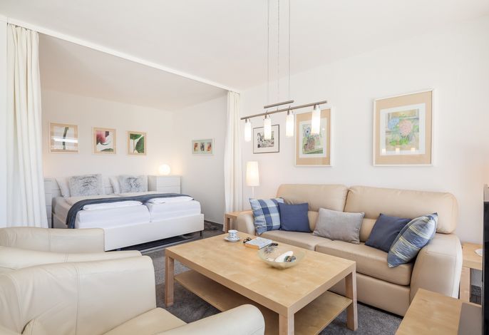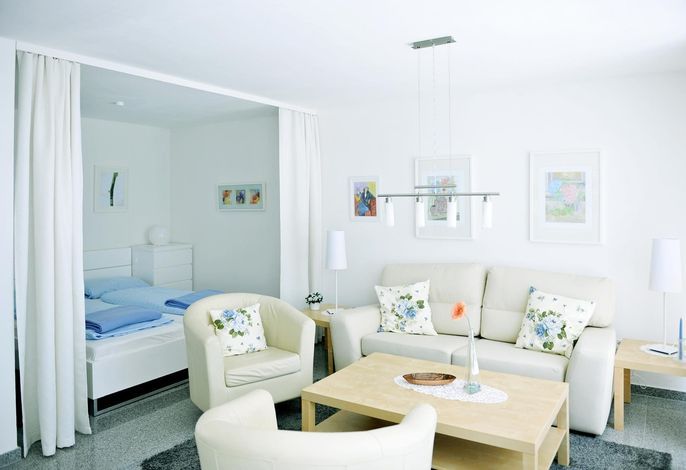 Der gemütliche Wohnbereich bietet neben SAT-TV auch viel Gemütlichkeit z.B. zum Lesen oder Ausruhen. Der Schlafbereich mit Doppelbett ist vom Wohnbereich durch einen Vorhang getrennt.