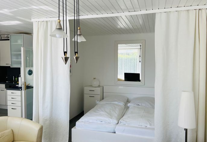 Probiers mal mit Gemütlichkeit: Der gemütliche Wohnbereich bietet neben SAT-TV auch Möglichkeiten z.B. zum Lesen oder Ausruhen. Der Schlafbereich ist vom Wohnbereich durch einen Vorhang getrennt.