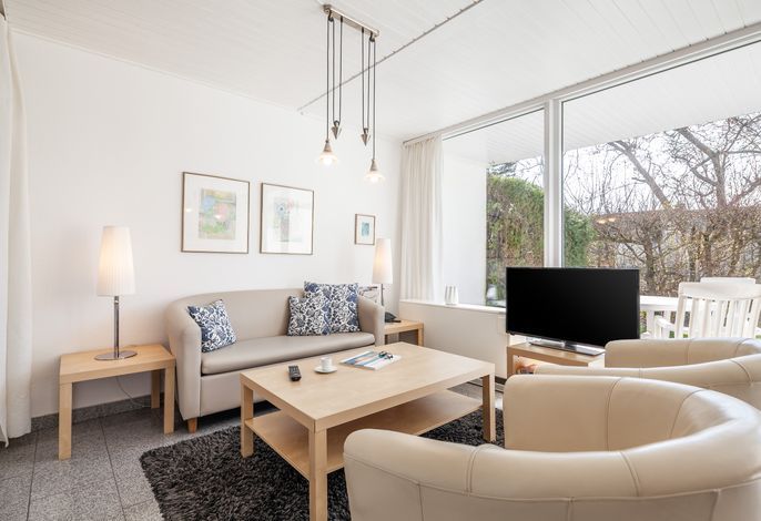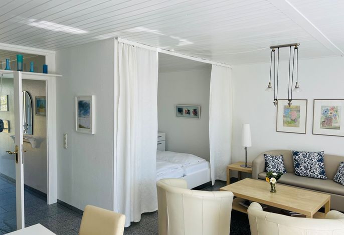Probiers mal mit Gemütlichkeit: Der gemütliche Wohnbereich bietet neben SAT-TV auch Möglichkeiten z.B. zum Lesen oder Ausruhen. Der Schlafbereich ist vom Wohnbereich durch einen Vorhang getrennt.