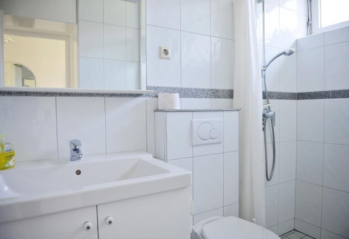 Die Dusche ist bodentief und macht einen hellen und freundlichen Eindruck.