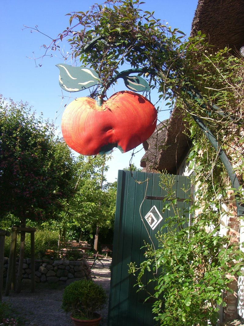 Der „Apfelgarten“ in Oldsum bietet selbstgebackene Kuchen und kleine Gerichte aus regionalen Zutaten. Von der Salatsauce über den Zwiebelkuchen und die Suppen bis zum Milchreis und der Roten Grütze wird hier alles selbst hergestellt. Die Eier stammen aus Oldsum von freilaufenden Hühnern oder werden in Bioqualität bezogen. Mehl, Milchreis, Mandeln, Käse (Hofkäserei Backensholz), Schinken (Hofschlachterei Muhs) und Gewürze stammen von zertifizierten Biohöfen. Die Kartoffeln für Bernhards Kartoffelcremesuppe liefert Jan Arfsten aus Süderende, die passierten Tomaten für Barbaras vegane Tomatensuppe kommen von „Zwergenwiese“. Abgerundet wird das Angebot mit Säften von Voelkel, Limonade von Proviant, mildem Urstrombier, spritzigem Elbler und hochwertigen Weinen, alles aus ökologischem Landbau.