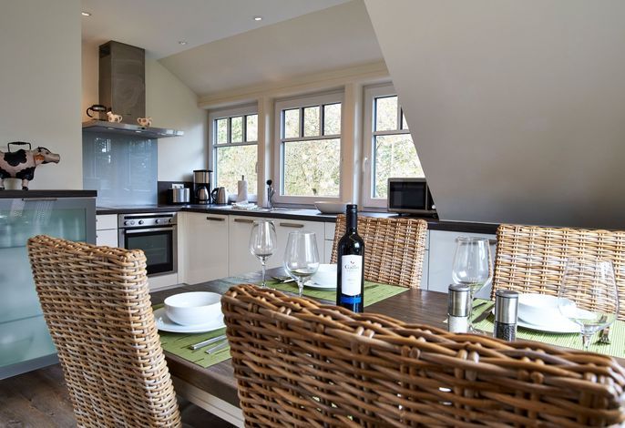 Die Wohnung befindet sich im Obergeschoß und verfügt über einen Mini-Balkon für 2 Personen und eine Terrasse im Garten. Im Wohnbereich gibt es eine gemütliche Couch, eine voll ausgestattete Küche, ein Kaminofen für kühle Abende, ein Duschbad und zwei Schlafzimmer. Zur Wohnung gehört ein PKW-Stellplatz vor dem Haus, Ihre Fahrräder können Sie beim Haus oder im Fahrradschuppen abstellen. Im Keller des Hauses steht Ihnen eine gemeinschaftliche Sauna mit Ruheliegen kostenfrei zur Verfügung - so kommt auch Ihre Gesundheit nicht zu kurz.