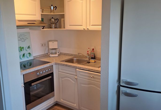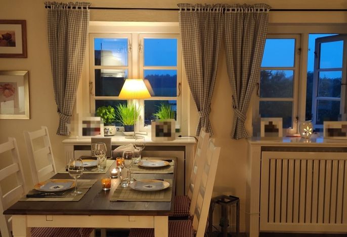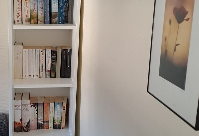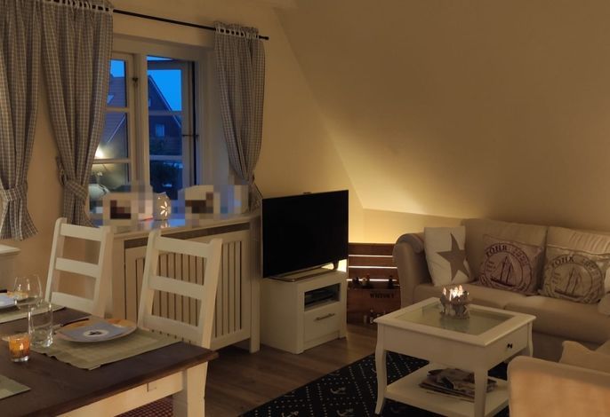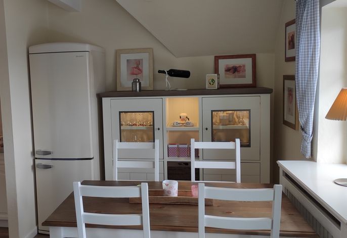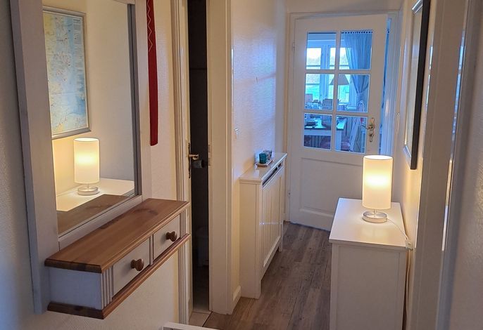 Hinter der Eingangstür erwartet Sie eine gemütliche und liebevoll eingerichtete 3-Zimmer-Ferienwohnung. Alle Zimmer sind direkt über den Flur erreichbar. Das Wohn-Esszimmer besticht durch seinen herrlichen Weitblick in Richtung Deich. In den Sommermonaten können Sie hier vom Sofa aus die schönsten Sonnenuntergänge Föhrs erleben. Neben der gemütlichen Sofaecke in der mit Flachbild-TV, Blu-Ray-Player und Radio (UKW/Internetradio/USB) auch an regnerischen Tagen für beste Unterhaltung gesorgt ist, gibt es einen Essbereich mit Esstisch und 4 Stühlen sowie eine Einbauküche, die trotz ihrer kompakten Maße jeglichen Komfort bietet. Dort finden Sie eine große Kühl-/Gefrierkombination, eine große Spülmaschine, einen Herd/Backofen , sowie Kaffeemaschine, Toaster und einen Wasserkocher. Das Badezimmer ist mit einer (Regen-)Dusche/Badewanne, einer Waschmaschine sowie einem Haartrockner und einem Kosmetikspiegel ausgestattet. Das Hauptschlafzimmer verfügt über einen Einbauschrank, 2 Kommoden und als Besonderheit über 2 Zimmertüren, für jede Bettseite eine, was gerade nachts einige Vorteile bietet. Zudem kann die tiefe Fensterbank hier auch als Wickeltisch genutzt werden. Das 2. Schlafzimmer ist mit einem Einbauschrank, Schlafsofa, Schreibtisch, Wäscheständer und einer kleinen Bibliothek nebst Mini-Videothek ausgestattet.