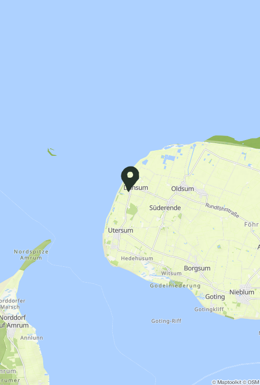 Der Deichhof ist in der Gemeinde Dunsum angesiedelt, die im Westen der Insel Föhr liegt. Er liegt an der ruhigen Ortsdurchfahrtstraße und reicht bis zu den weitläufigen Wiesenflächen, die direkt an den 500 m entfernt liegenden Deich der Nordsee angrenzen, mitten in die Natur eingebettet. Der Deichhof kann somit als Oase der Ruhe betrachtet werden.