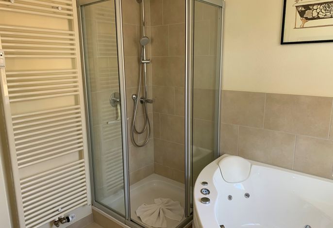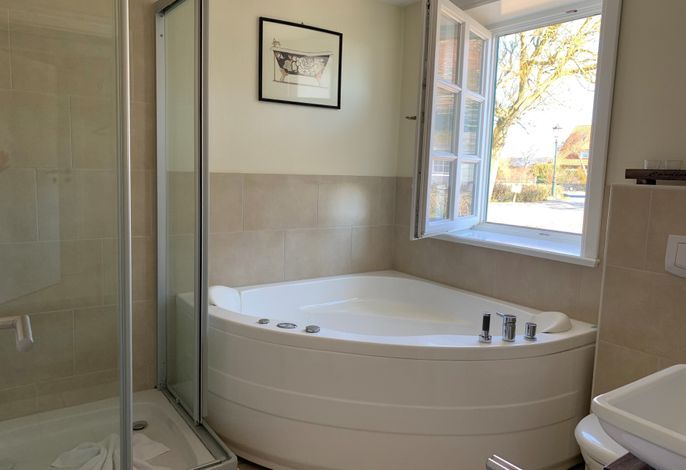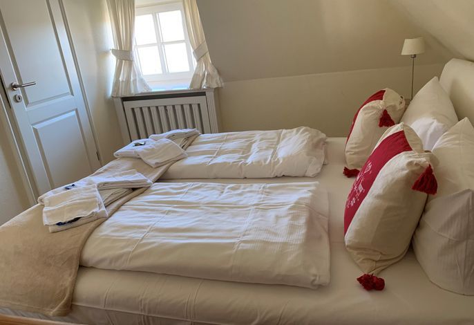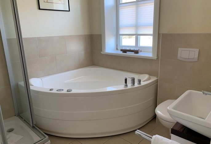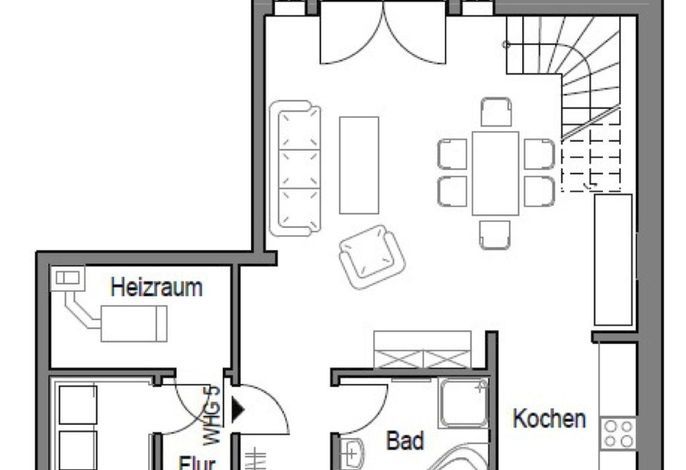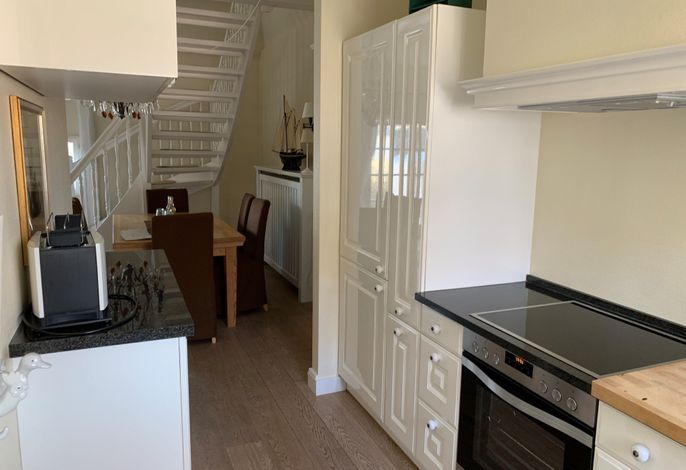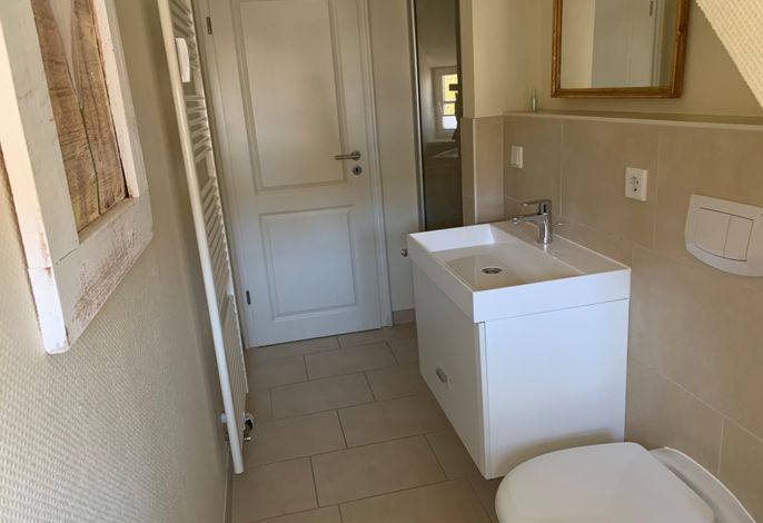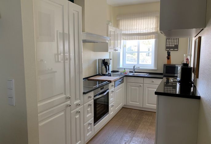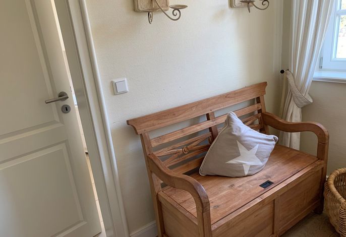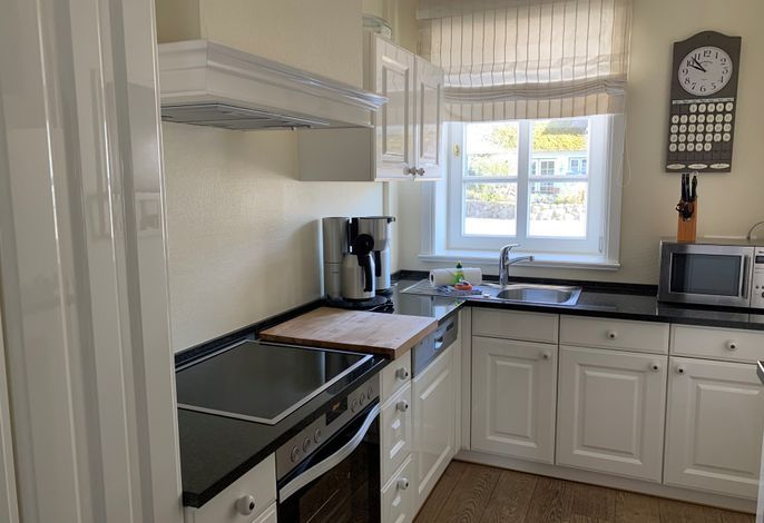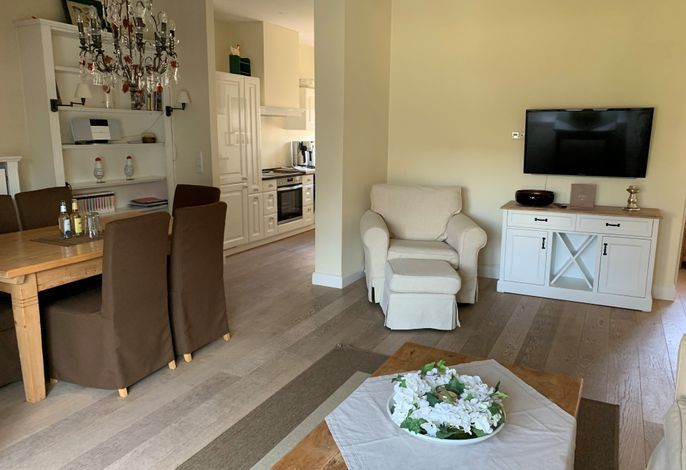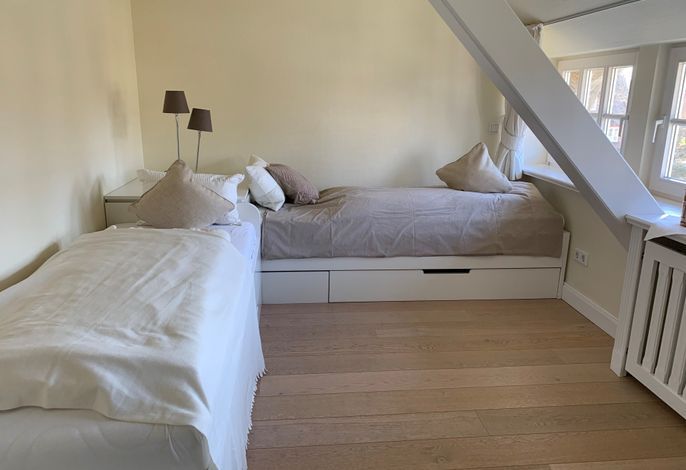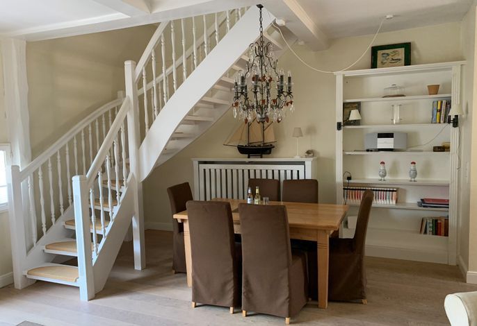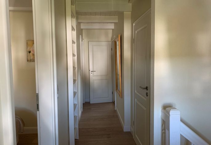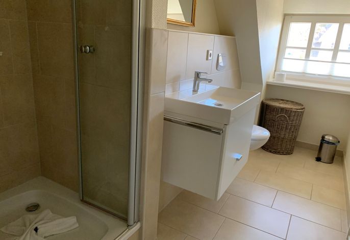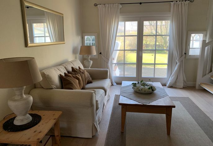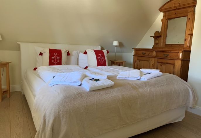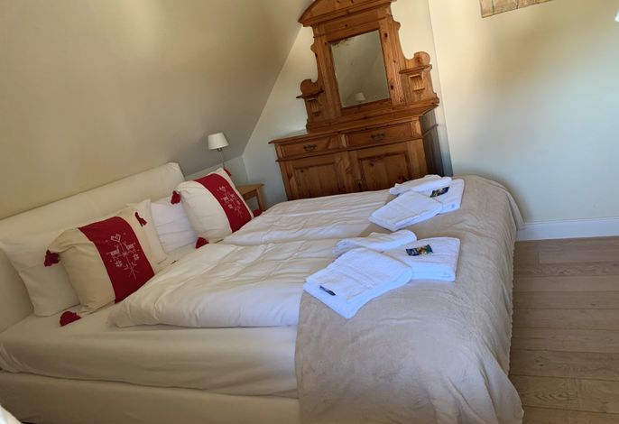 Dieses hochwertig ausgestattete Hausteil umfasst im Erdgeschoss den Wohn- und Essbereich mit Ausgang zur Südterrasse, eine offene Einbauküche, Vollbad/WC, Garderobe und HW-Raum. Im Dachgeschoss liegen Schlafzimmer, Gästezimmer mit großer Abseite, Duschbad/WC und Flur mit Einbauschrank. Ein ansprechendes Ferienobjekt mit stilvollen Ausstattungsdetails erwartet Sie - weitab von der Hektik des Alltags.
