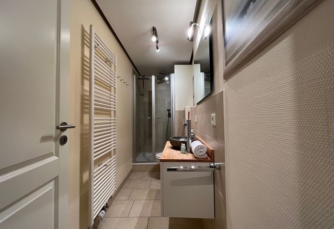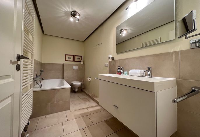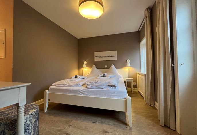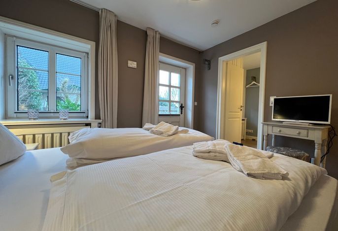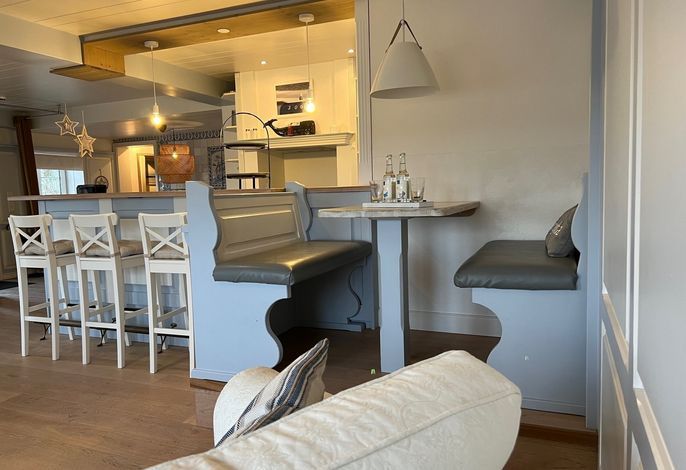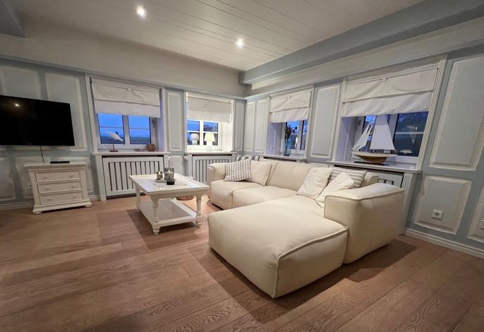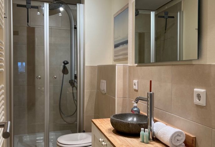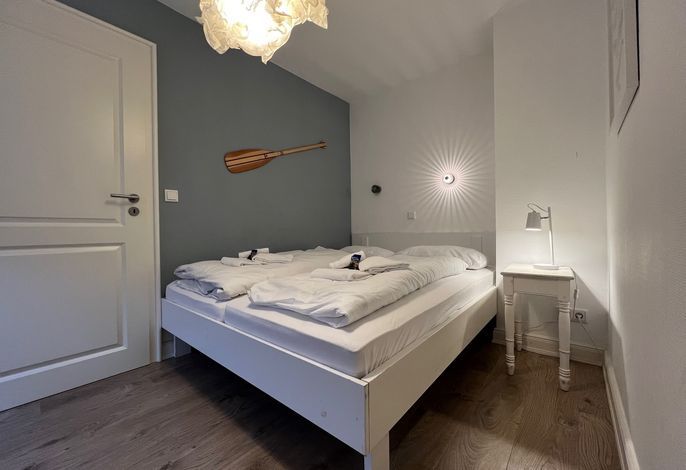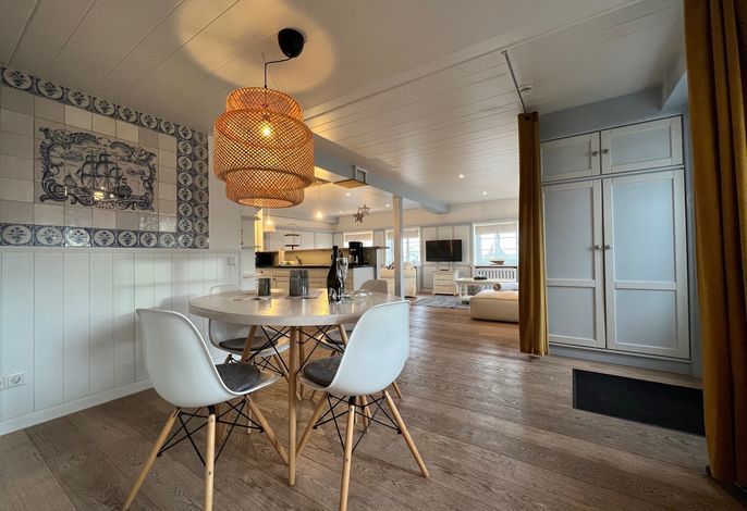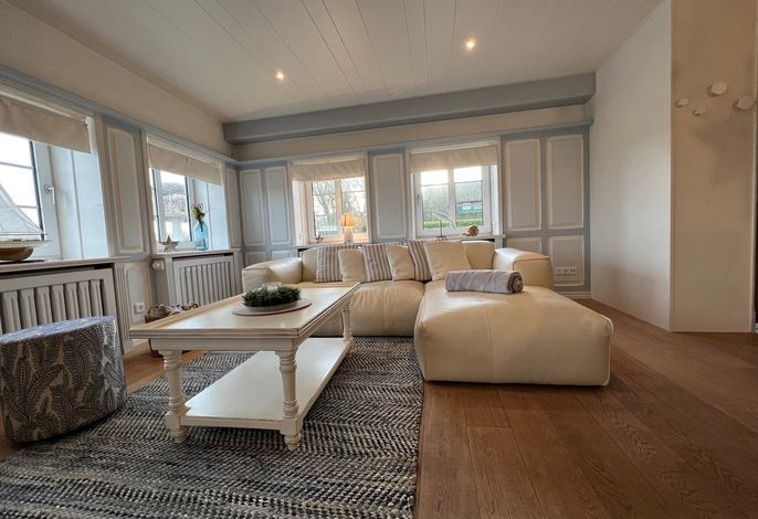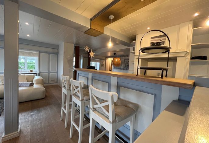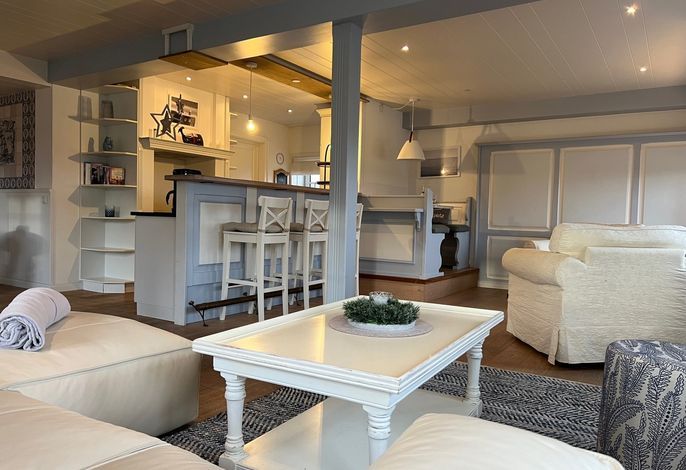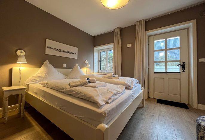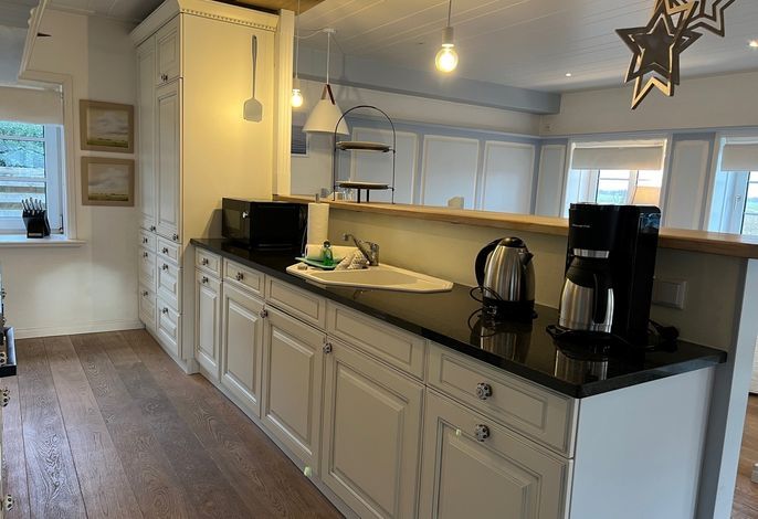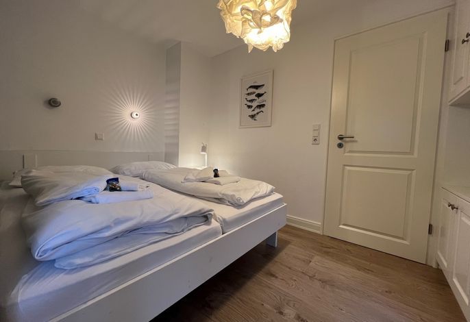 Unsere modern und wertig eingerichtete Ferienwohnung verfügt über zwei schöne Schlafzimmer, ein großes Wohnzimmer mit Wohnküche und ein geräumiges Badezimmer sowie ein zusätzliches Dusch-WC. In beiden Schlafzimmern befindet sich ein Doppelbett. So haben in der Wohnung maximal vier Personen Platz. Die helle und freundliche Atmosphäre in den Räumen lädt zum Essen, Trinken und Verweilen ein. Die Wohnung befindet sich barrierearm im Erdgeschoss und verfügt über einen eingezäunten Garten an der Südseite des Hauses, der gerne von Ihnen genutzt werden darf. Im Garten befindet sich eine gemütliche, moderne Sitzgelegenheit zum Frühstücken und gemeinsamen Essen sowie zwei Sonnenliegen. Im Strandkorb können Sie die wunderschönen Sonnenuntergänge genießen oder auf der Bank vor dem Haus nachts die Sternschnuppen zählen.