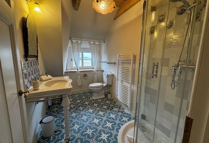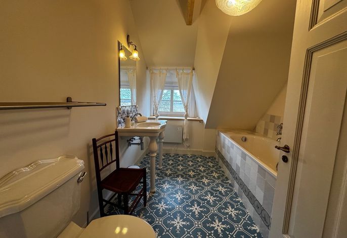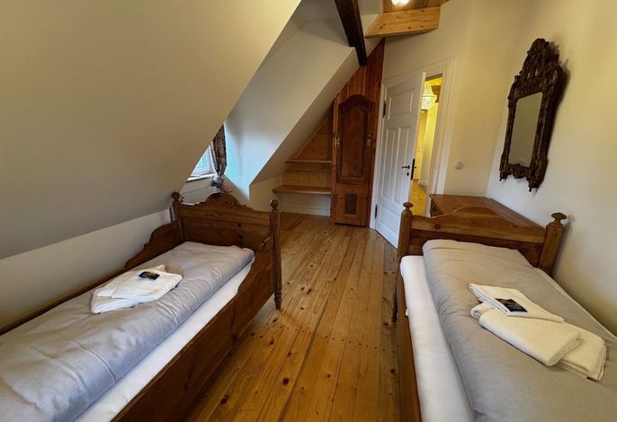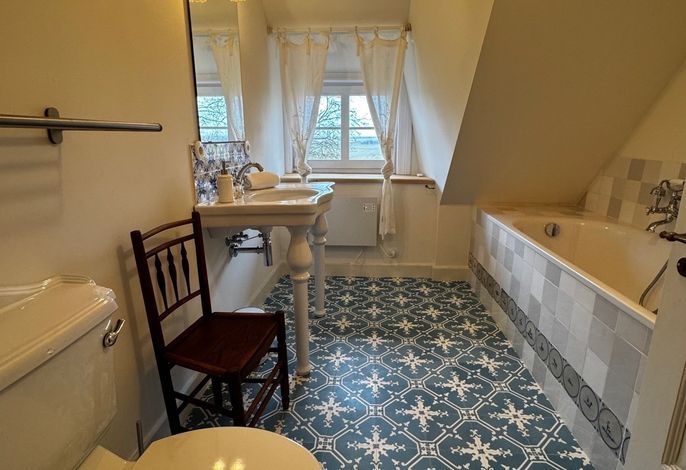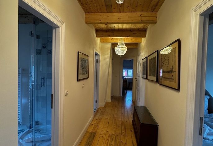 An den Wohnbereich angrenzend über den Flur gelangen Sie in ein kleines Schlafzimmer mit schmalem Doppelbett (120cm x 200cm). Das geräumige, zweite Schlafzimmer mit Doppelbett (180cm x 200cm) bietet angenehmen Schlafkomfort. Das dritte Schlafzimmer mit zwei kleineren Einzelbetten (80cm x 180cm) empfehlen wir für Kinder bis 12 Jahren. In dieser Obergeschoss-Wohnung genießen Sie Badekomfort in zwei Badezimmern. Einmal mit Badewanne, WC und Waschbecken und das zweite Bad mit Dusche, WC und Waschbecken.