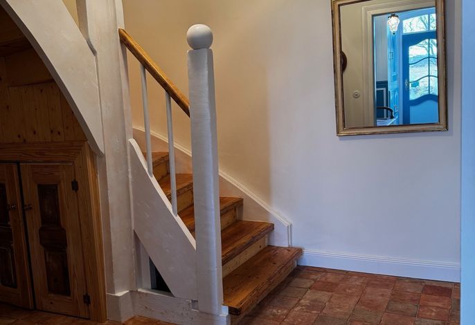 Auf gut 83 m² Wohnfläche ist hier Platz für erholsames Urlaubsglück für maximal 5 Personen. Über den Hauseingang in die Diele gelangen Sie über einen Treppenaufgang in die helle und freundliche Wohnung Oberdeck. Der grosszügige, im Friesenstil mit Gallionsfiguren gehaltenen Wohnzimmerbereich wurde mit Liebe zum Detail eingerichtet und schließt den offenen Küchen- und Esszimmerbereich mit ein.
