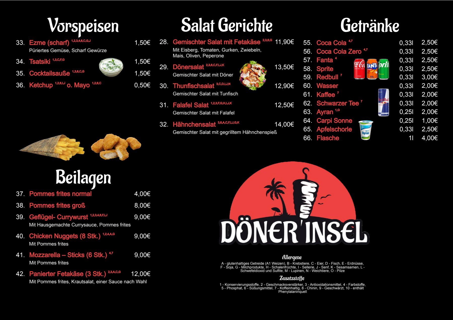 Kebap Grillgerichte 1. Grill Mix 23,90 2. Lammkotelett 21,90 3. Lammspieß 19,90 4. Köfte Frikadellen 15,00 5. Hähnchenbrustspieß 19,90 Döner Gerichte 6. Döner im Brot 8,50 7. Döner im Brot mit Fetakäse 9,50 8. Jumbo...