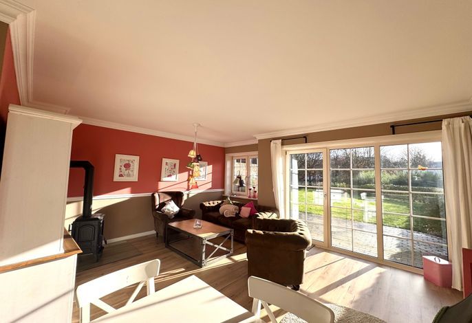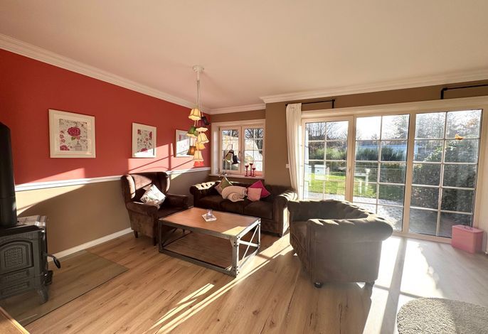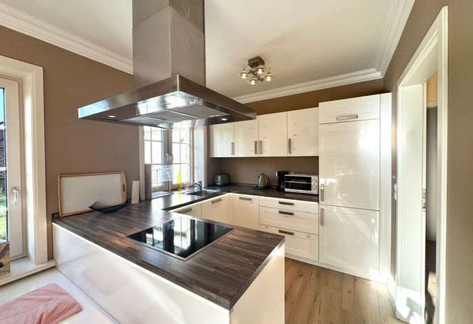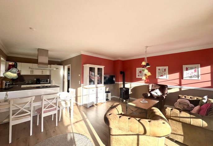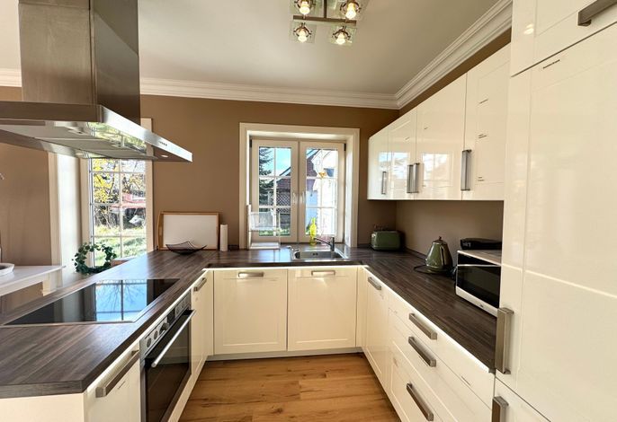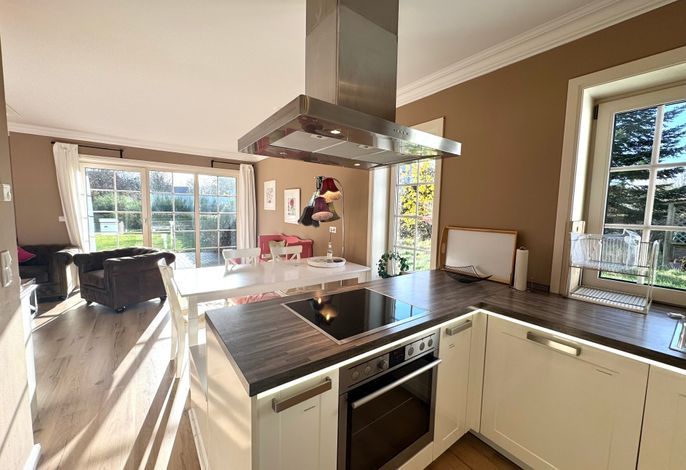 Vom Wohnbereich haben Sie auch einen direkten Zugang auf die Süd-Terrasse mit Gartenmöbeln und Strandkorb. In der vollausgestatteten Küche finden Sie unter anderem: