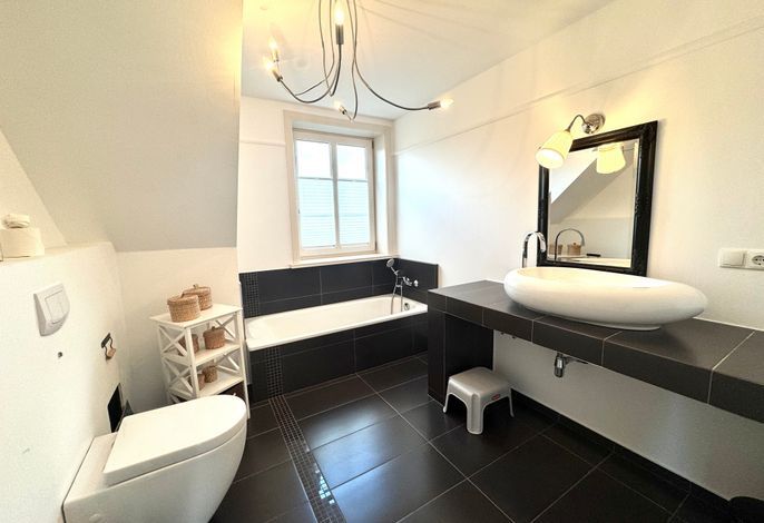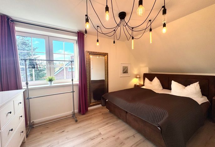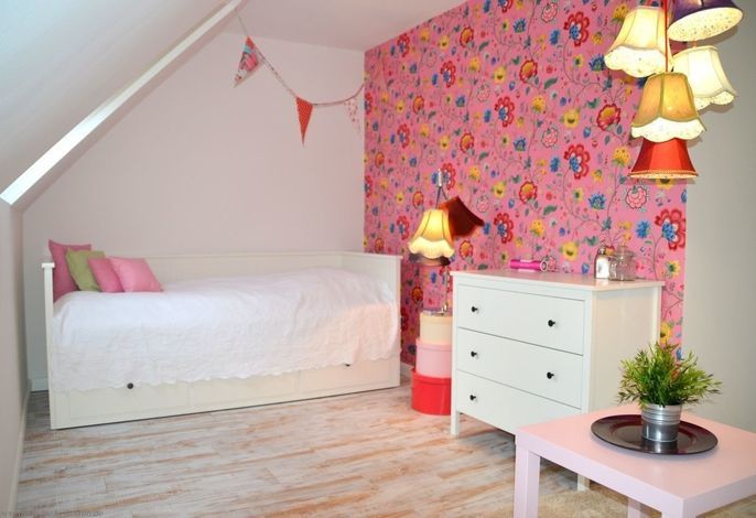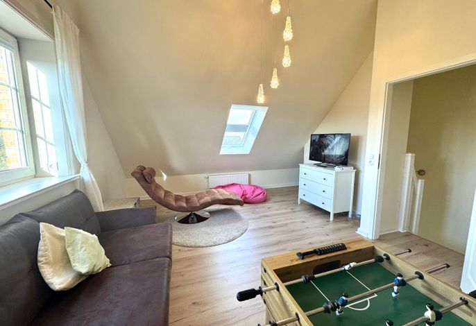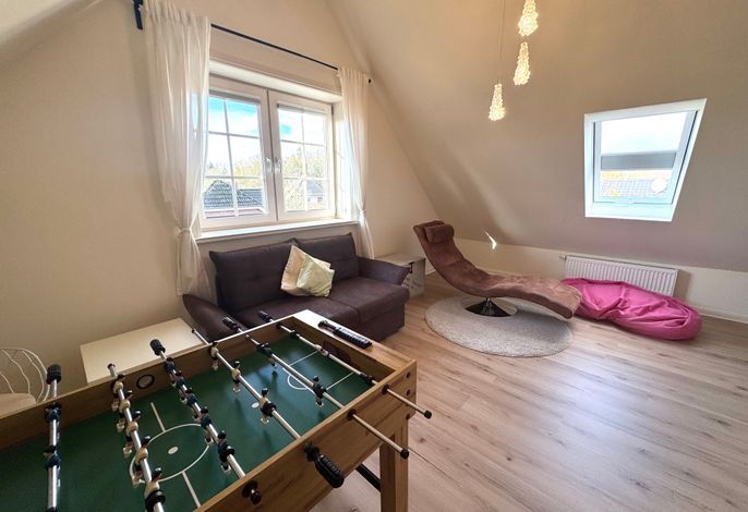 Die drei Schlafzimmer - 1x mit Doppelbett ( 180 x 200cm ), 1x mit zwei Einzelbetten, 1x mit einem Einzelbett- stehen Ihnen im Obergeschoss zur Verfügung, ebenso das Wannenbad / WC. Im Dachgeschoss befindet sich ein weiterer Aufents/Schlafraum mit Schlafcouch, 2 Sitzsäcken zusätzlichem TV, einer Wii-Spielekonsole und Tischfussball, sollte das Wetter mal nicht so passend sein.