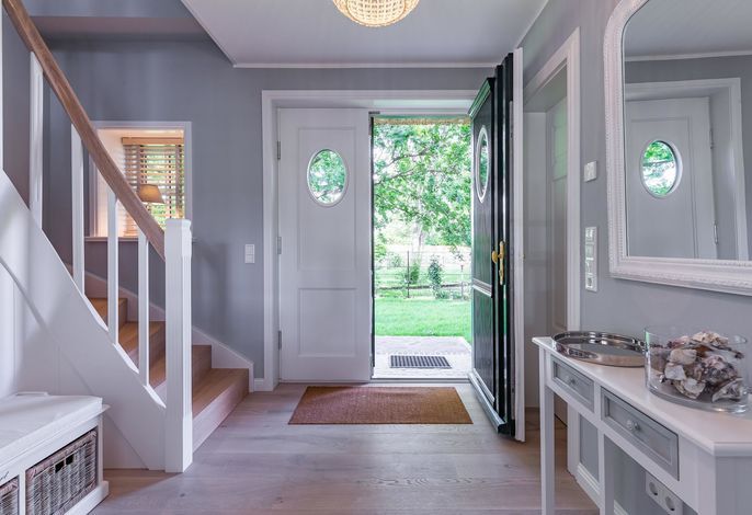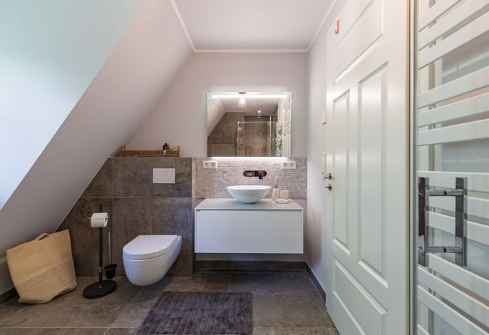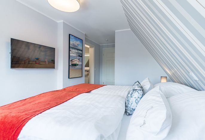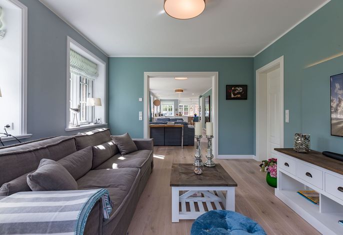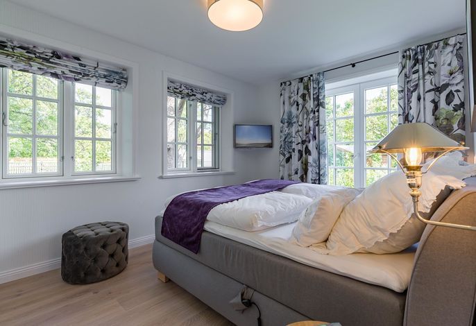 Im Erdgeschoss befindet sich noch ein Schlafraum mit angrenzendem Bad. Im Obergeschoß verteilen sich dann weitere drei Schlafräume und zwei Bäder sowie eine Galerie mit Schreibtisch. Im Außenbereich haben Sie ein Saunahaus mit Fitnessbereich. Perfekt auch für die stürmische Herbst- und Winterzeit. Im Sommer genießen Sie den Garten, und der Tisch auf der Terrasse wird schon morgens zum Frühstück eingedeckt. Urlaub und Erholung, wie es sein sollte.