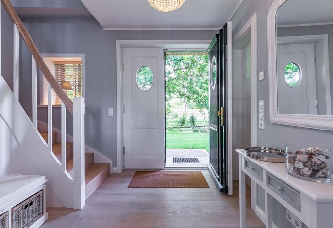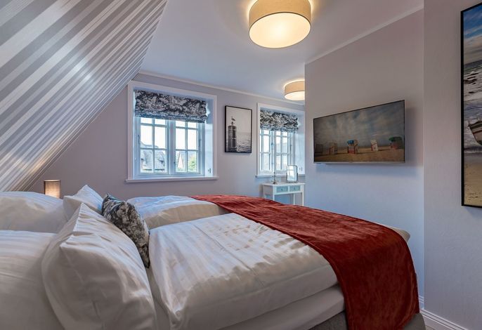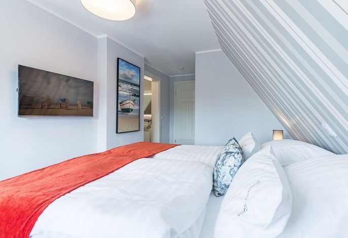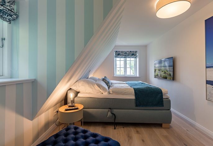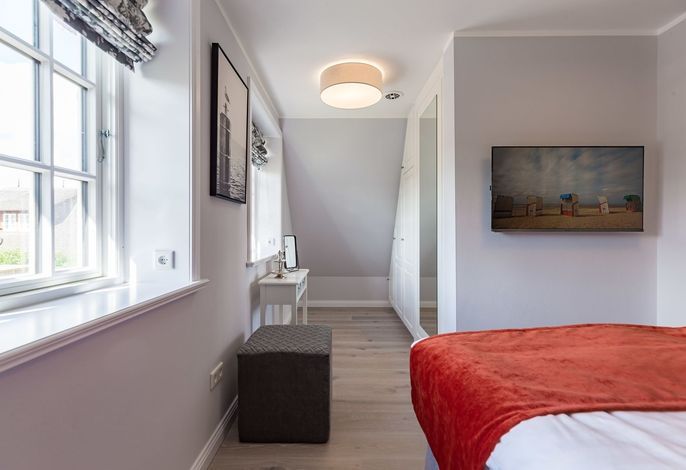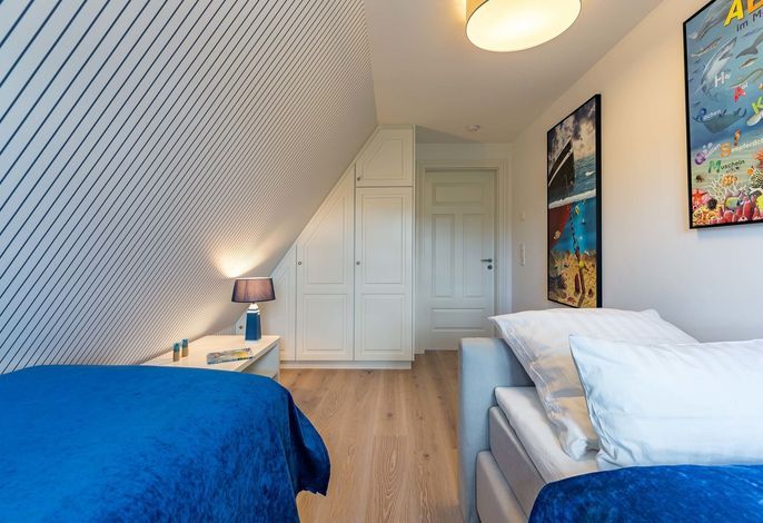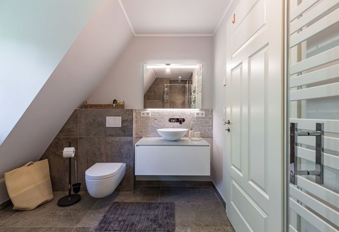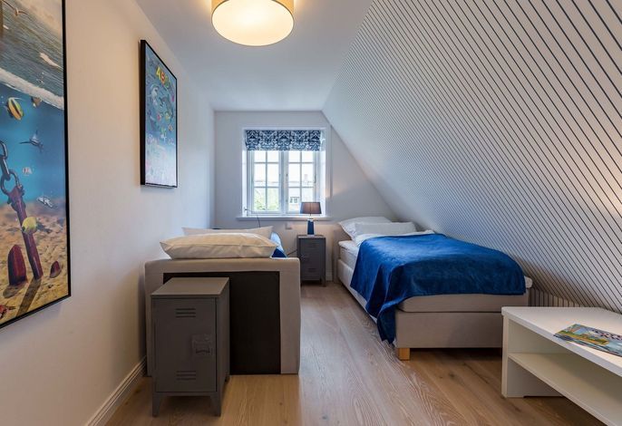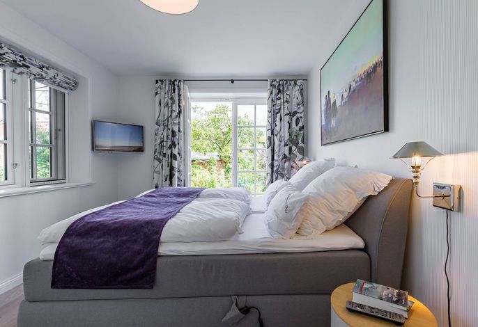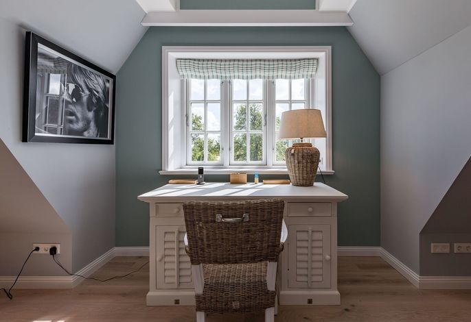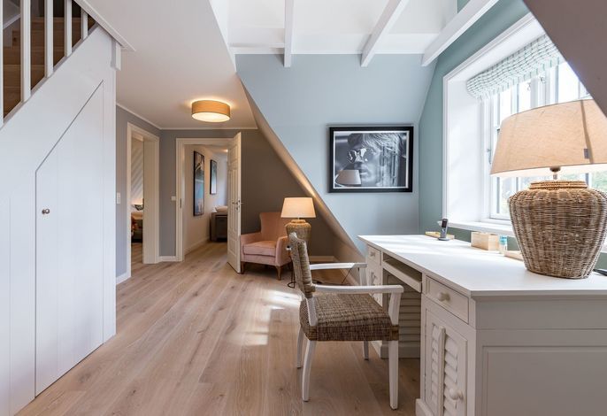 Im Erdgeschoss befindet sich noch ein Schlafraum mit angrenzendem Bad. Das Obergeschoß teilen sich drei weitere Schlafräume und zwei Bäder sowie eine Galerie mit Schreibtisch. Im Außenbereich haben Sie ein Saunahaus mit Fitnessbereich. Perfekt auch für die stürmische Herbst- und Winterzeit. Im Sommer genießen Sie den Garten. Der Tisch auf der Terrasse kann schon morgens zum Frühstück gedeckt werden. So sollten Urlaub und Erholung für Sie sein.