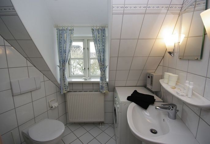 Das maritim gestaltete Badezimmer mit Dusche, Waschmaschine und Fenster sorgt für zusätzlichen Komfort.