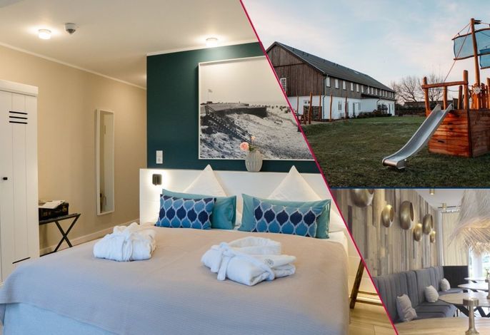 Der groß angelegte Spielplatz auf dem Grundstück ist eine Wohlfühloase für Ihre Kinder - von Seilbahn und Schaukel über ein Basketballfeld bis Trampolin gibt es viele Möglichkeiten zum Austoben. Der Spielplatz steht ausschließlich den Gästen des Hotels zur Verfügung. Bei schlechtem Wetter erheitern Tischtennis und Kicker sowie eine Ecke zum Spielen und Toben in der Spielscheune die Gemüter. In einem vom restlichen Garten abgetrennten Bereich lädt die Fass-Sauna mit Ruheraum und Außendusche zum Relaxen in Strand-Ambiente ein - Erholung pur! Der große Parkplatz mit E-Auto-Ladestation auf dem Grundstück oder der kostenfreie Shuttle vom Hafen zum Hotel (mit Voranmeldung) runden das Angebot ab.