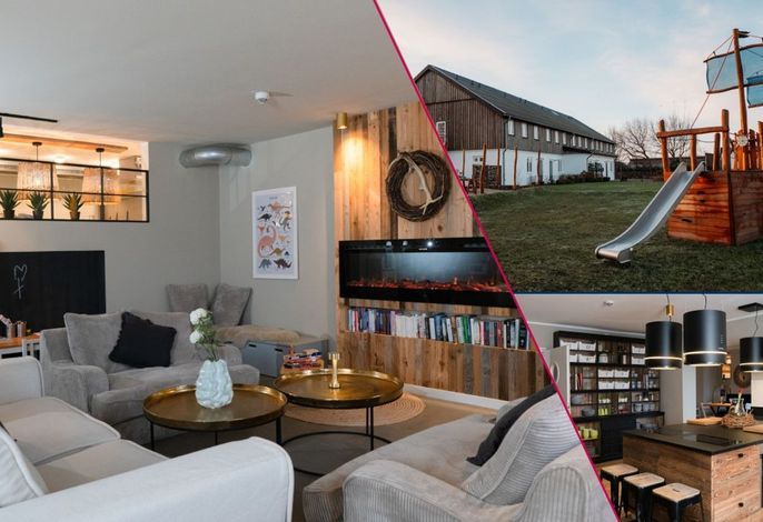 Der groß angelegte Spielplatz auf dem Grundstück ist eine Wohlfühloase für Ihre Kinder - von Seilbahn und Schaukel über ein Basketballfeld bis Trampolin gibt es viele Möglichkeiten zum Austoben. Der Spielplatz steht ausschließlich den Gästen der Ferienanlage Landliebe zur Verfügung. Bei schlechtem Wetter erheitern Tischtennis und Kicker sowie eine Ecke zum Spielen und Toben die Gemüter. In einem vom restlichen Garten abgetrennten Bereich lädt die Fass-Sauna mit Ruheraum und Außendusche zum Relaxen in Strand-Ambiente ein - Erholung pur! Der große Parkplatz mit E-Auto-Ladestation auf dem Grundstück rundet das Angebot ab.