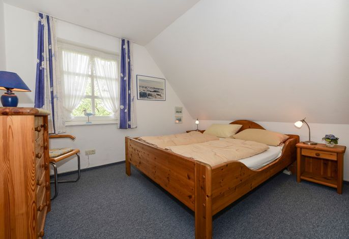 Im Schlafzimmer sorgt ein komfortables Doppelbett für erholsamen Schlaf, während eine Kommode und ein Einbauschrank viel Platz für Ihre Urlaubsgarderobe bieten.