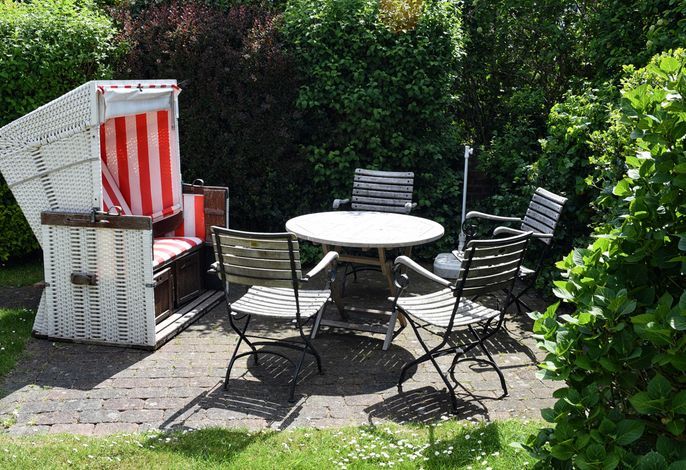 mit Strandkorb und Gartenmöbeln.
