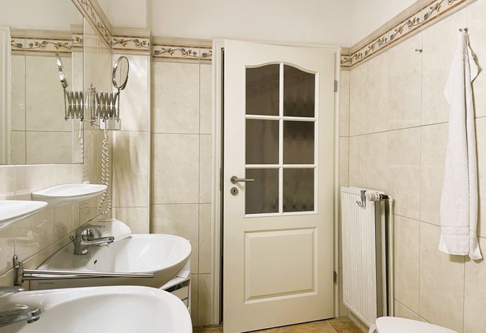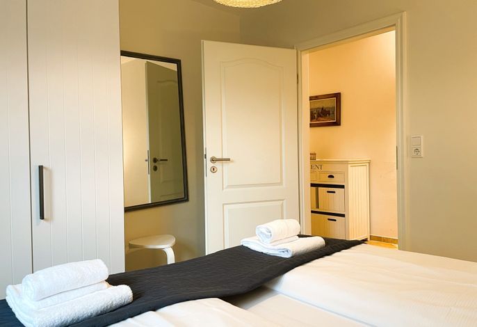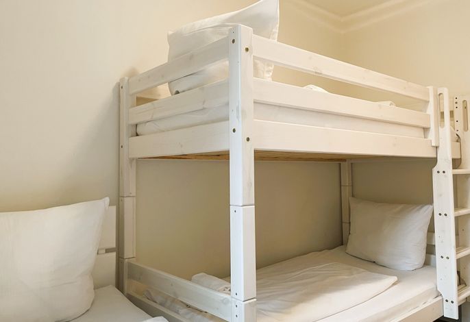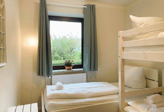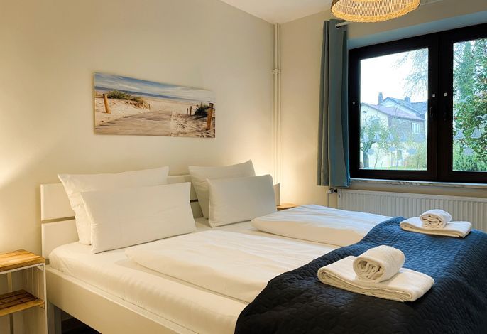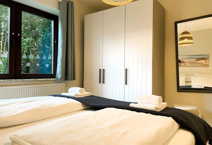 Das Hauptschlafzimmer ist mit einem Doppelbett ausgestattet, während das zweite Schlafzimmer ein Einzelbett sowie ein Etagenbett in Erwachsenengröße bietet. Das Badezimmer ist mit einem Vollbad, WC und zwei Waschplätzen ausgestattet und sorgt für zusätzlichen Komfort. Genießen Sie Ihren Aufenthalt in unserer komfortablen Ferienwohnung und erleben Sie Entspannung pur! Buchen Sie jetzt und sichern Sie sich Ihren perfekten Urlaub!