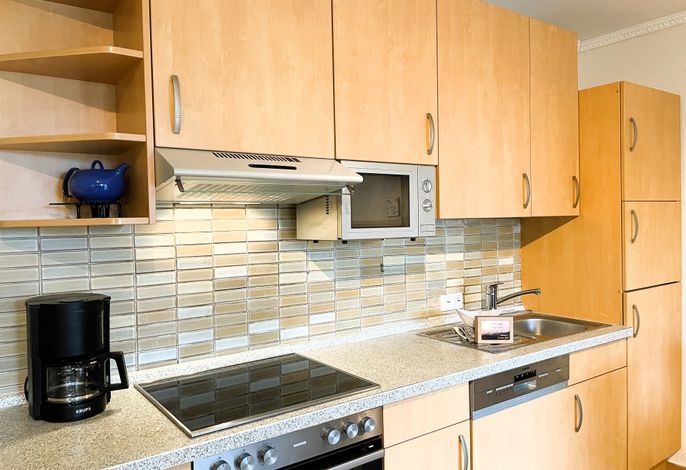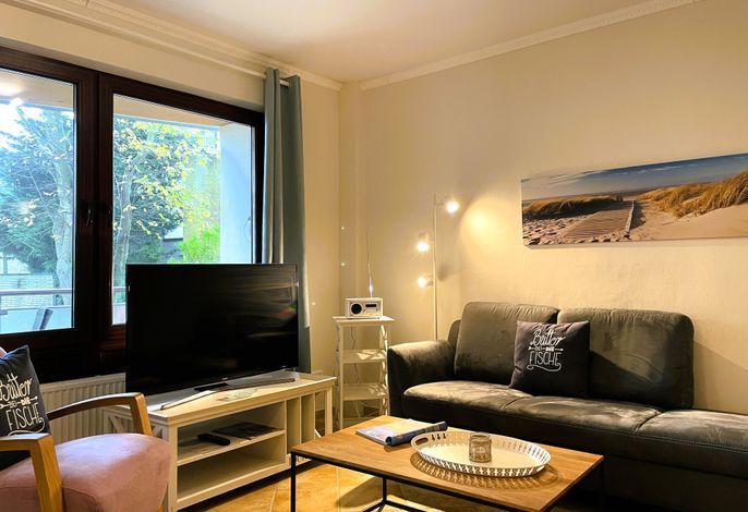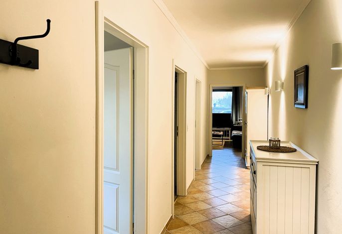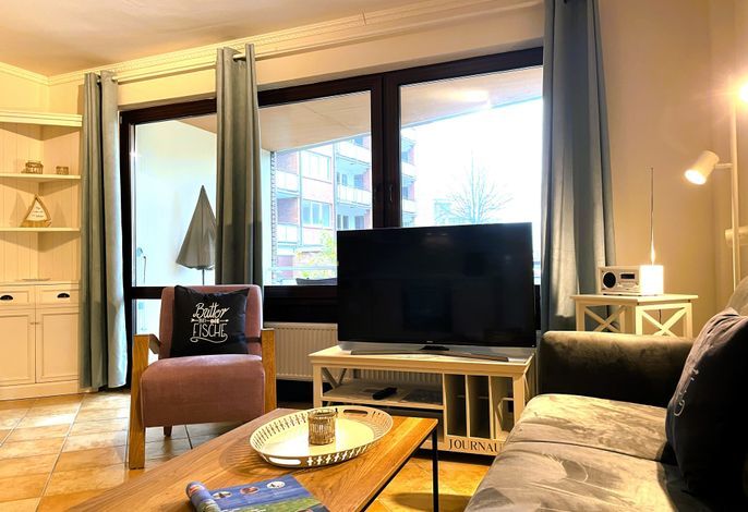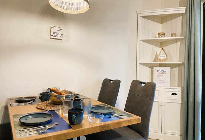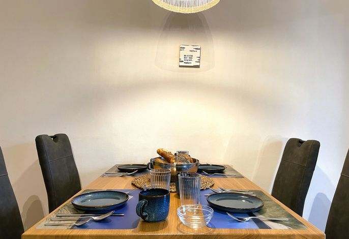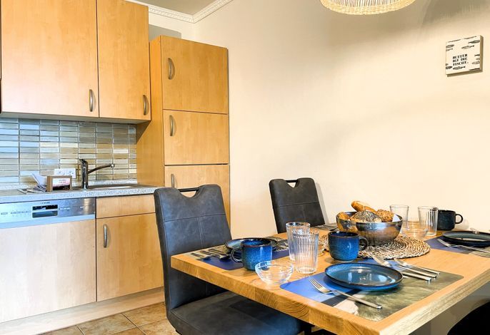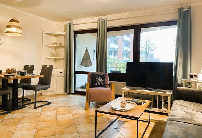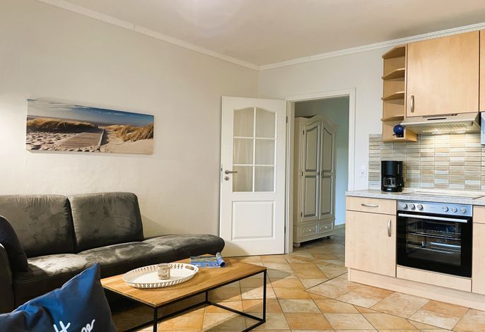 Entdecken Sie unsere großzügige Ferienwohnung, die ideal für einen komfortablen Familienurlaub bis zu 5 Personen ist. Die einzelnen Zimmer der hellen Ferienwohnungen sind alle vom Flur aus begehbar: Ein einladendes Wohnzimmer mit einer voll ausgestatteten Küchenzeile und einer bequemen Essgruppe bietet reichlich Platz und eignet sich ideal für gemütliche Film- oder Spielabende. Von hier aus gelangen Sie auf die nach Süden gelegene windgeschützte Loggia.