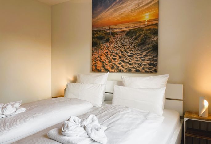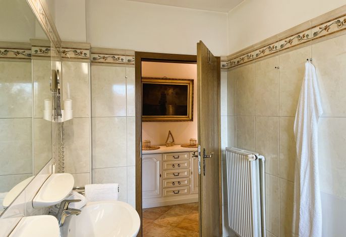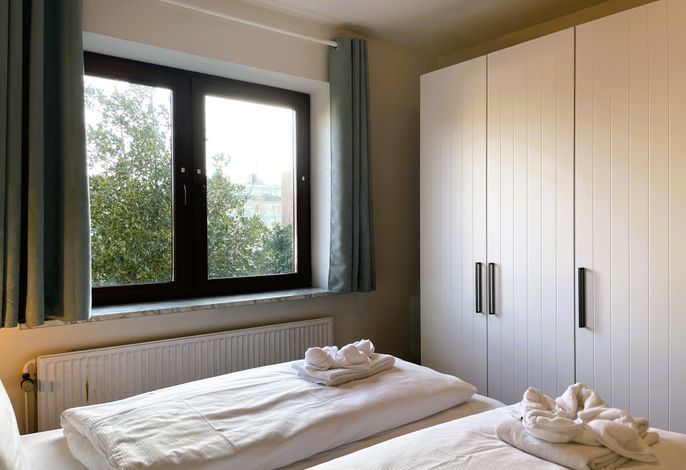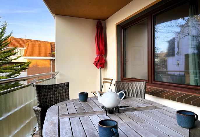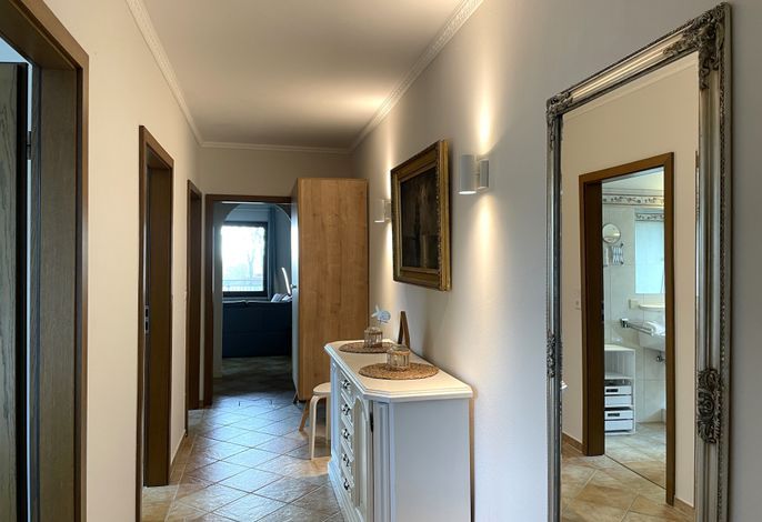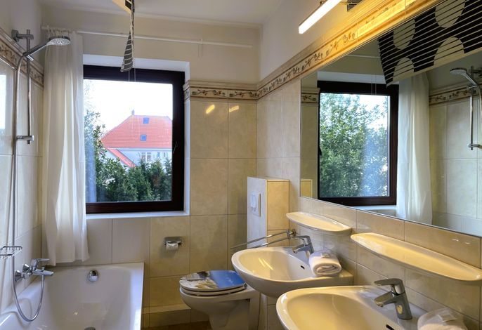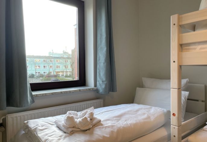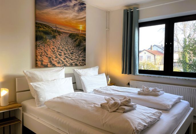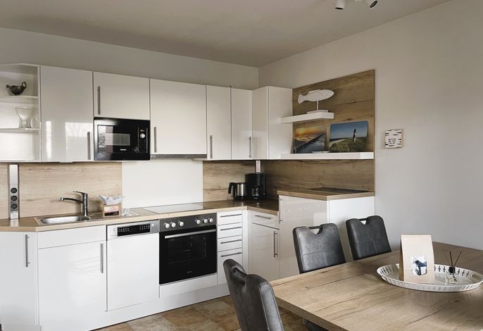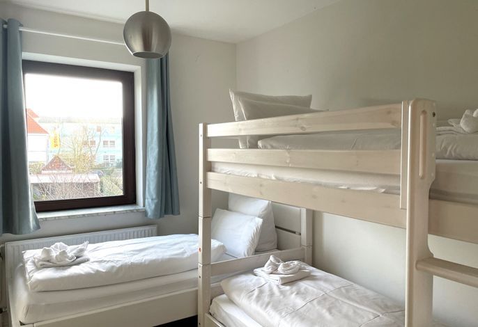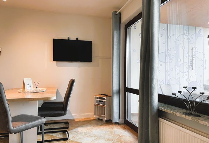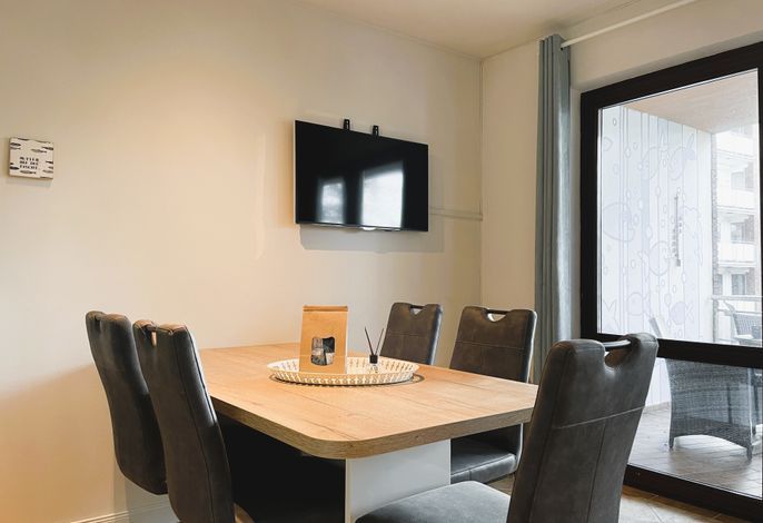 Das Herzstück der Wohnung ist das helle Wohnzimmer mit seiner voll ausgestatteten Küchenzeile. Hier können Sie gemeinsam kochen, essen und entspannen. Der Südbalkon lädt zum Verweilen ein und bietet einen wunderbaren Ausblick, besonders schön in den Abendstunden. Über einen zentralen Flur erreichen Sie die beiden Schlafzimmer: eines mit einem bequemen Doppelbett, das andere mit einem Einzel- und einem Etagenbett - alle in Erwachsenengröße. Das geräumige Badezimmer mit Vollbad, WC und zwei Waschplätzen komplettiert den Wohnkomfort. Unsere Ferienwohnung ist rauchfrei und tierfreundlich. Sie bietet kostenloses WLAN, Heizung und einen Privatparkplatz. Erleben Sie einen unvergesslichen Urlaub in unserer Ferienwohnung 5 - Ihr Zuhause fern von Zuhause!