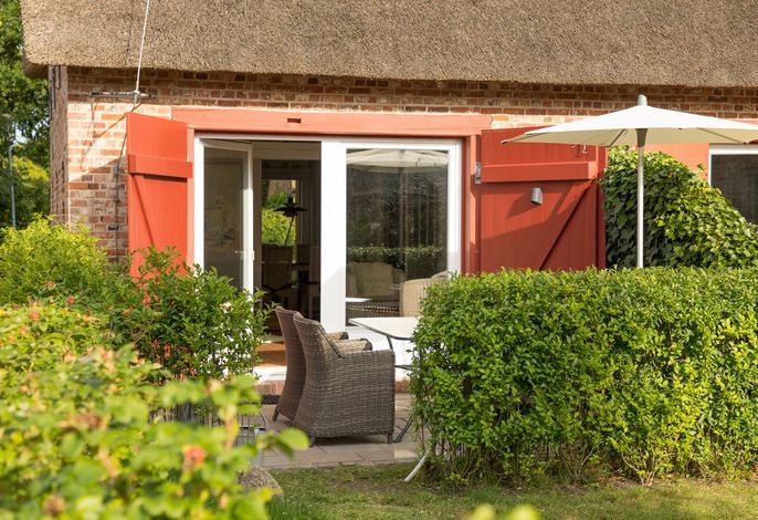 Willkommen im gepflegten Endhausteil Foftein in Borgsum auf Föhr. Im Nordwestgiebel des reetgedeckten Hauses mit mehreren Hausteilen erwartet Sie eine großzügige Unterkunft über zwei Etagen mit separatem Eingang und eigenem PKW-Stellplatz.
